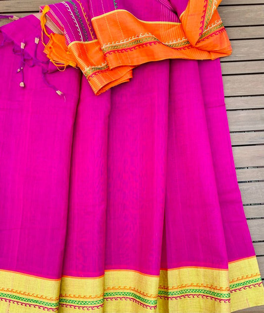 Khadi Saree w/ Lambani embroidery - Fuchsia/ Orange