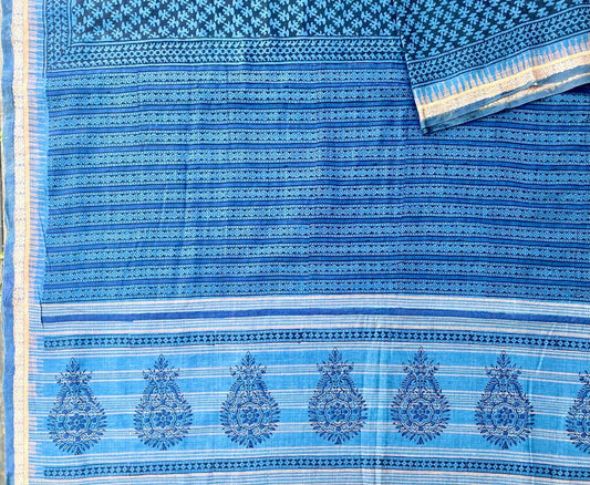 Khadi Saree w/ Bagru Hand block Print- Blue