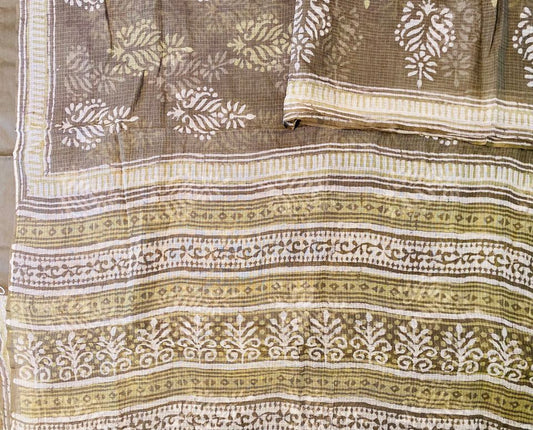 Kota Doria Saree w/ Bagru Hand block Print-Olive Green
