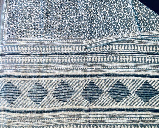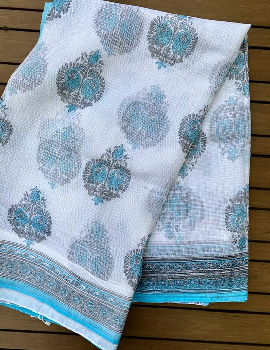 Kota Doria Saree w/ Bagru Hand block Print- White/ Light blue