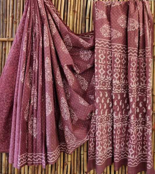 Mulmul Saree w/ Bagru Hand block Print- Mauve