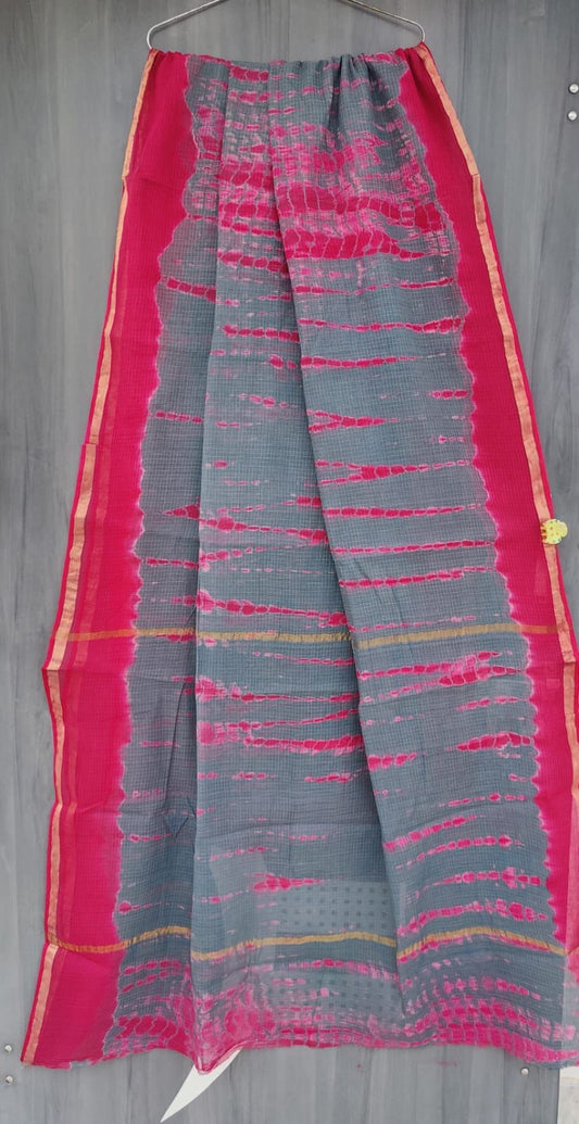 Kota Doria Saree w/ Shibori dye- Gray/ Fuchsia