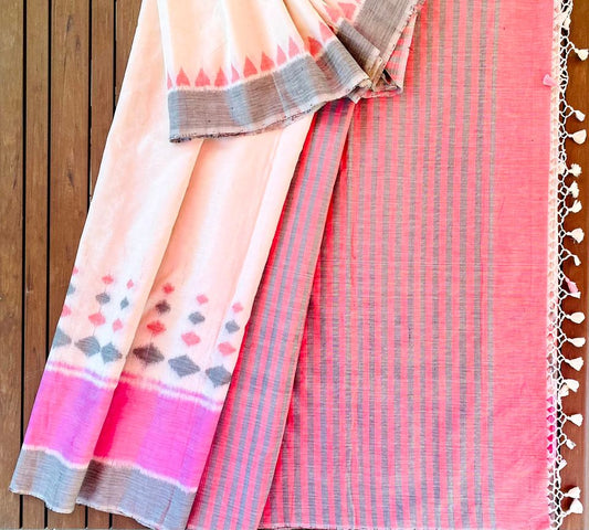 Khandua Ikat Handloom Silk Cotton Saree - White w/ Pink, Gray