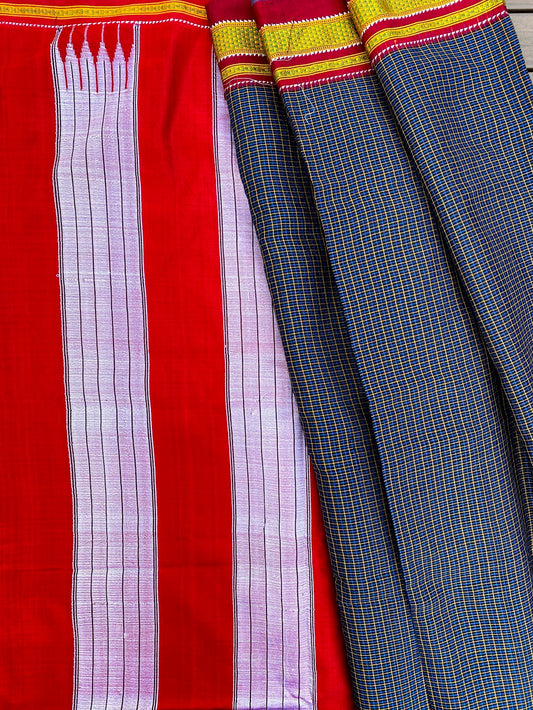 Patteda Anchu Handloom Saree - Maroon checks with Blue, Maroon