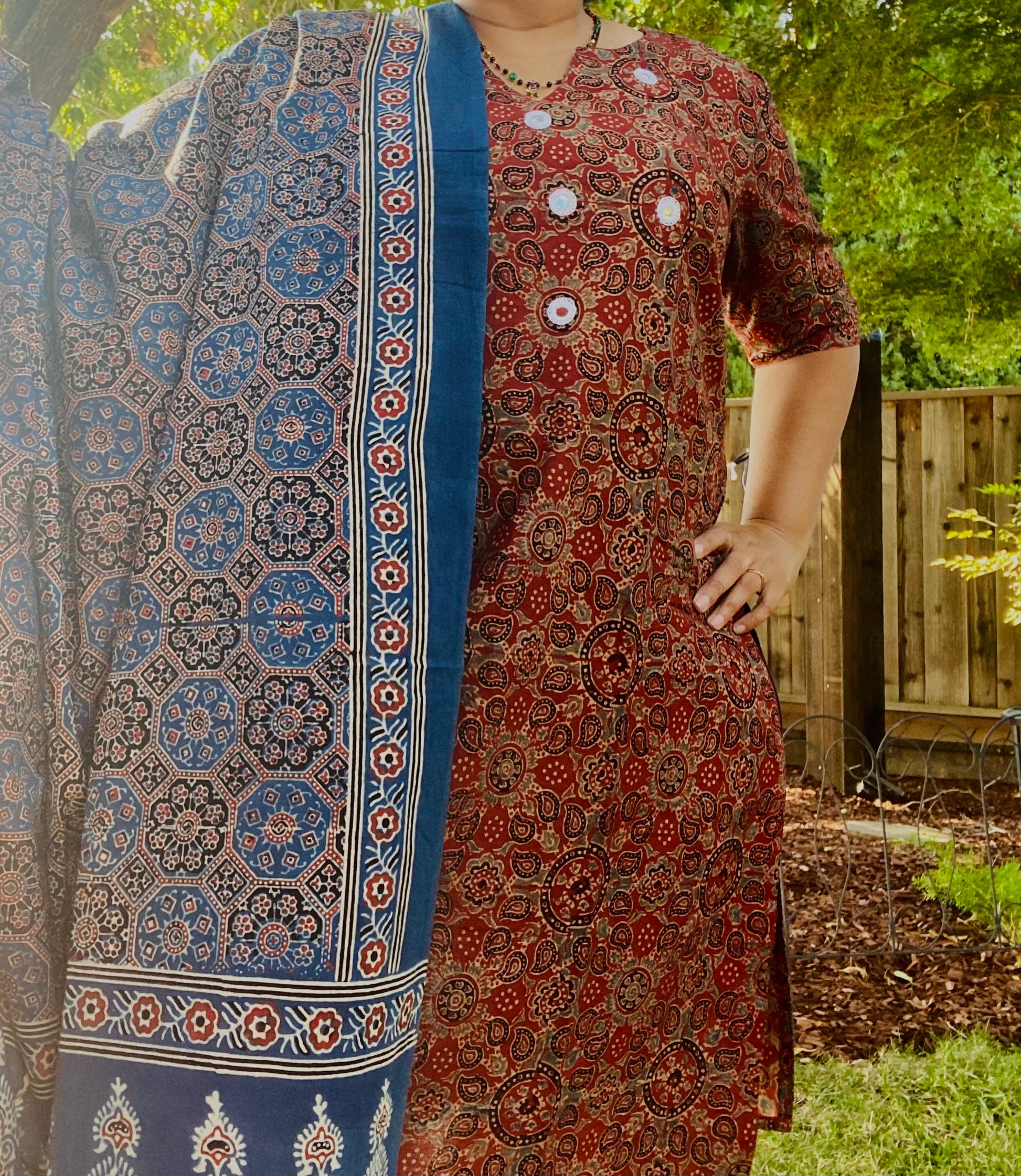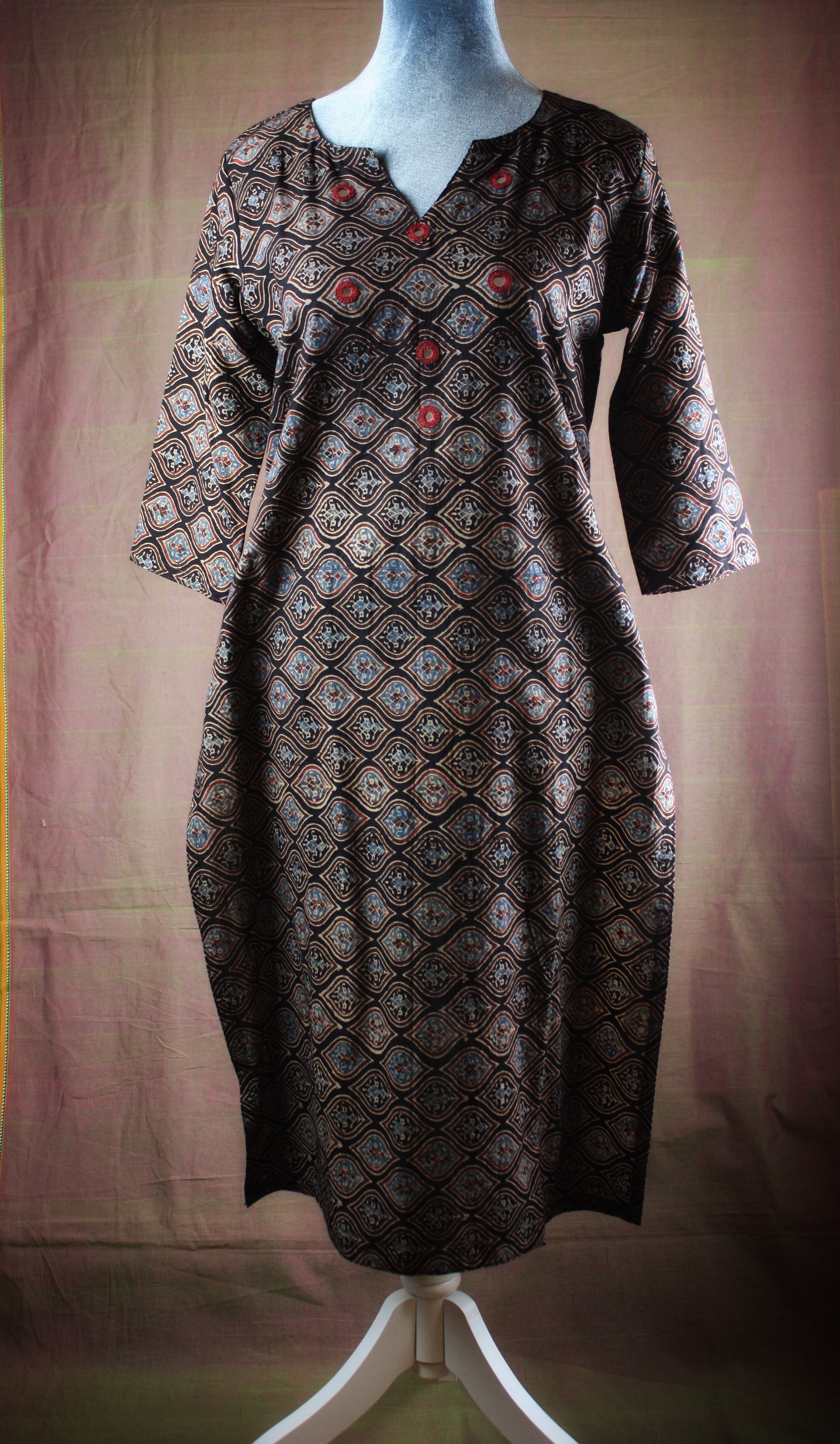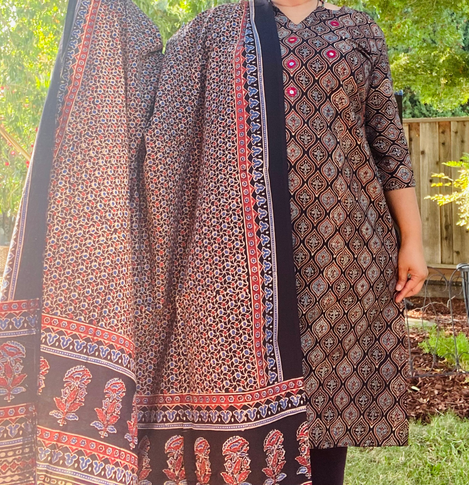 Ajrakh is a unique combination of hand block printing and resist dyeing craft that dates back to medieval times. In India, it is now practiced in Ajrakhpur, Gujarat by the khatris community. They characteristically have complex geometric patterns and floral motifs inspired by the islamic architecture. They use vegetable dyes in deep blue, red and black colors. These are hand crafted by an artisans from Kachchh district, Gujarat.