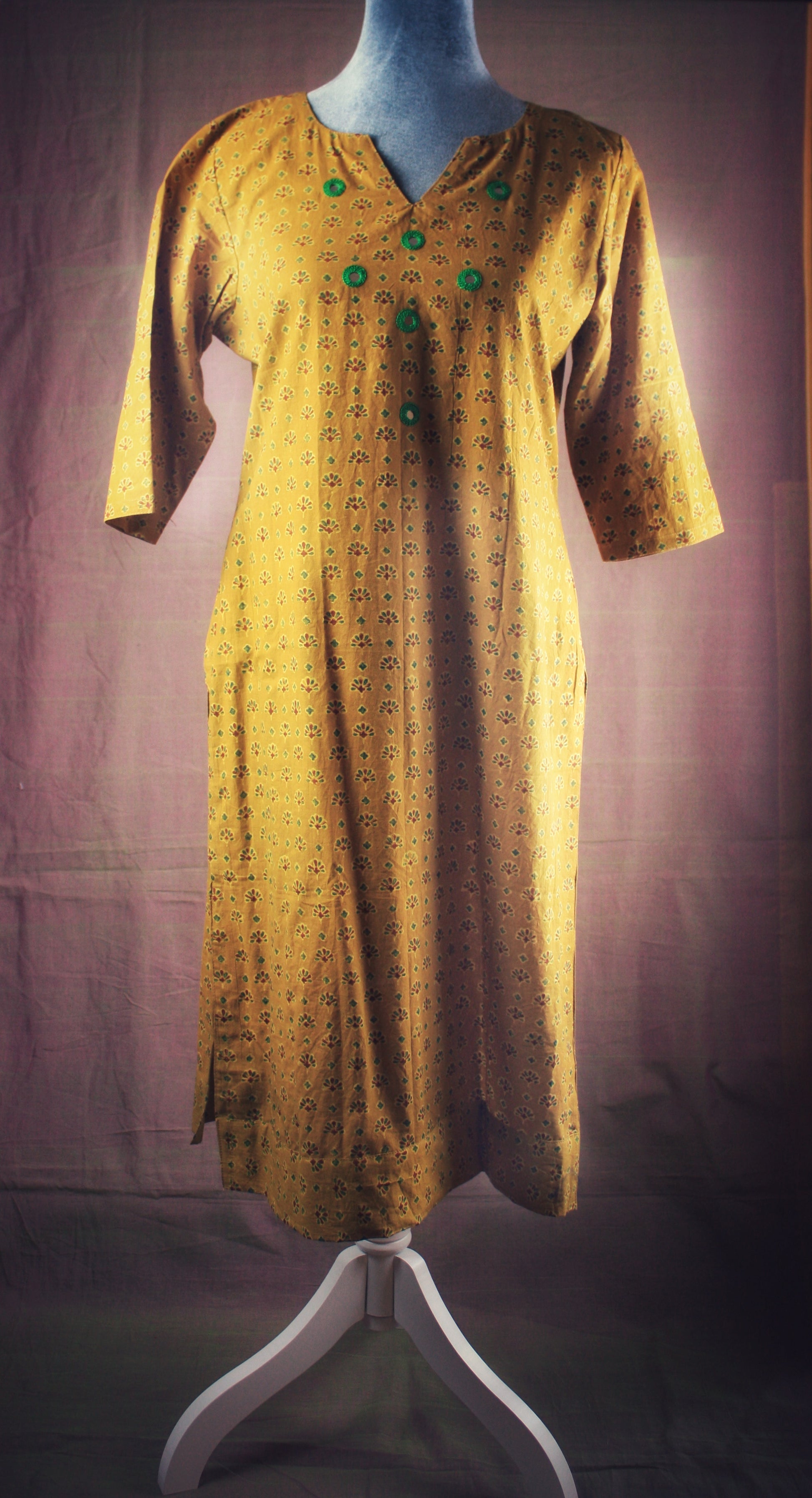 The colors combinations and precision of the complex geometric and floral patterns are all so alluring! One can simply stare at these hand block printed fabrics all day for they are so mesmerizing! The little mirrors embroidered to the yoke add an additional focal point.  Designs vary by color. Dupatta sold separately.