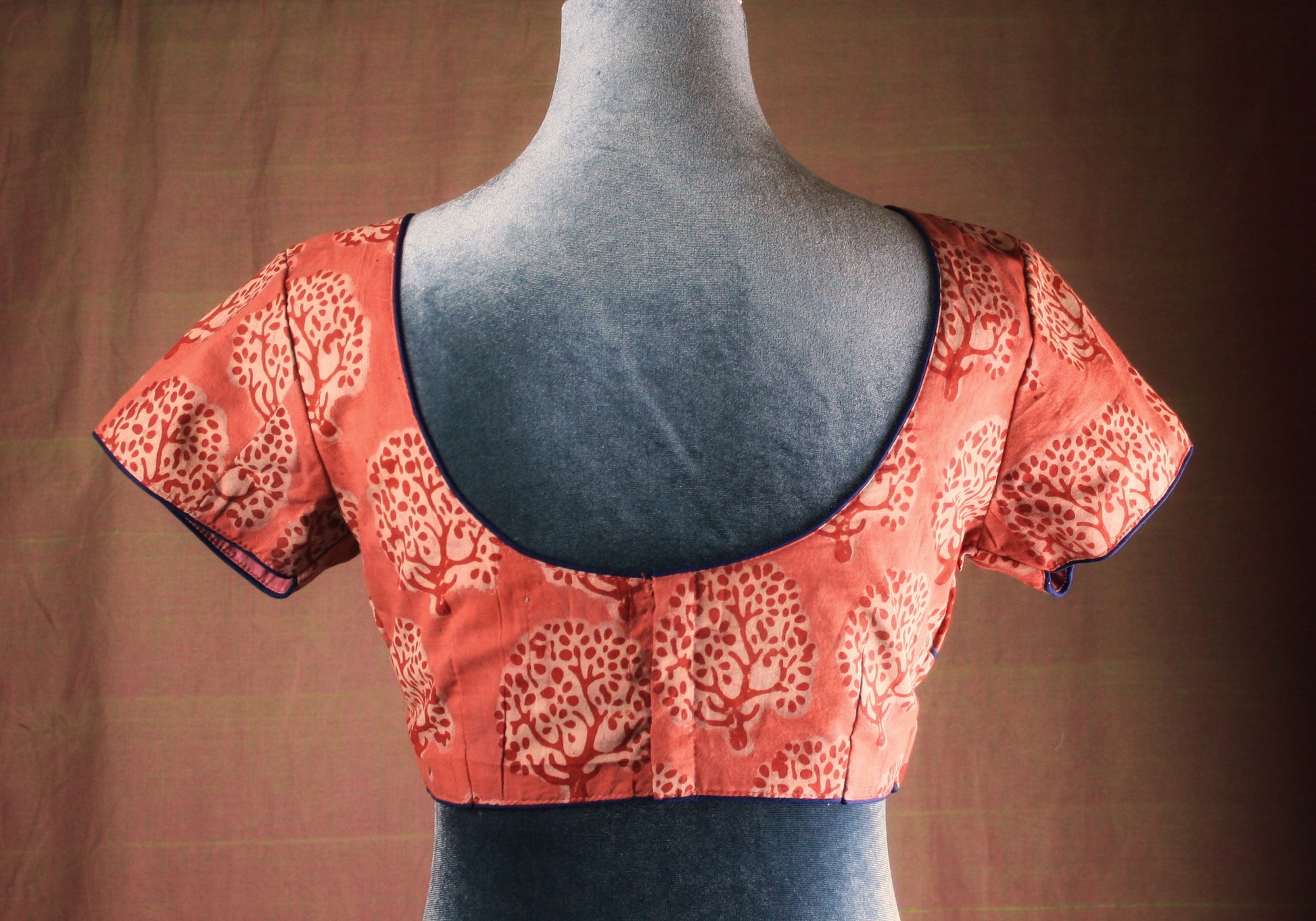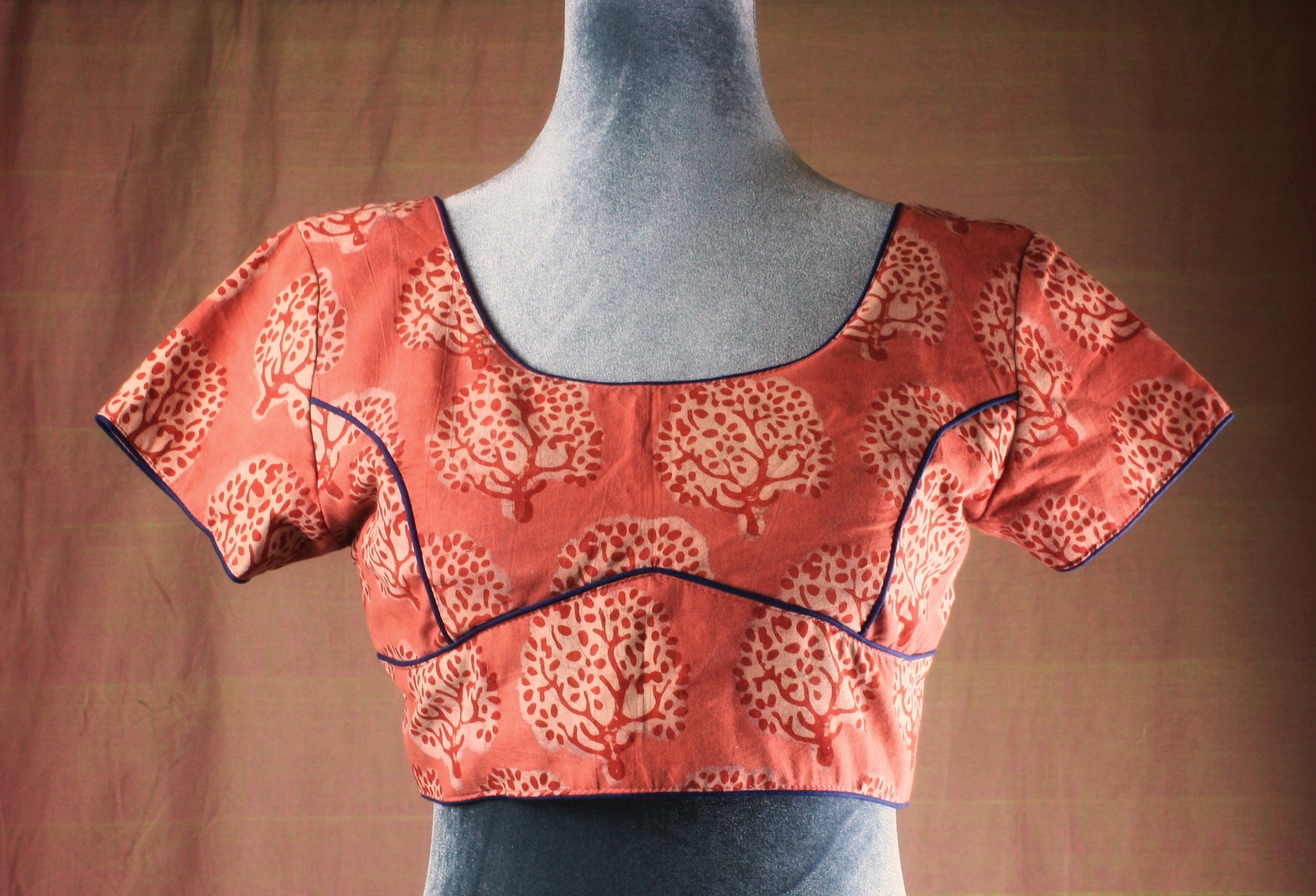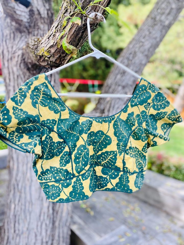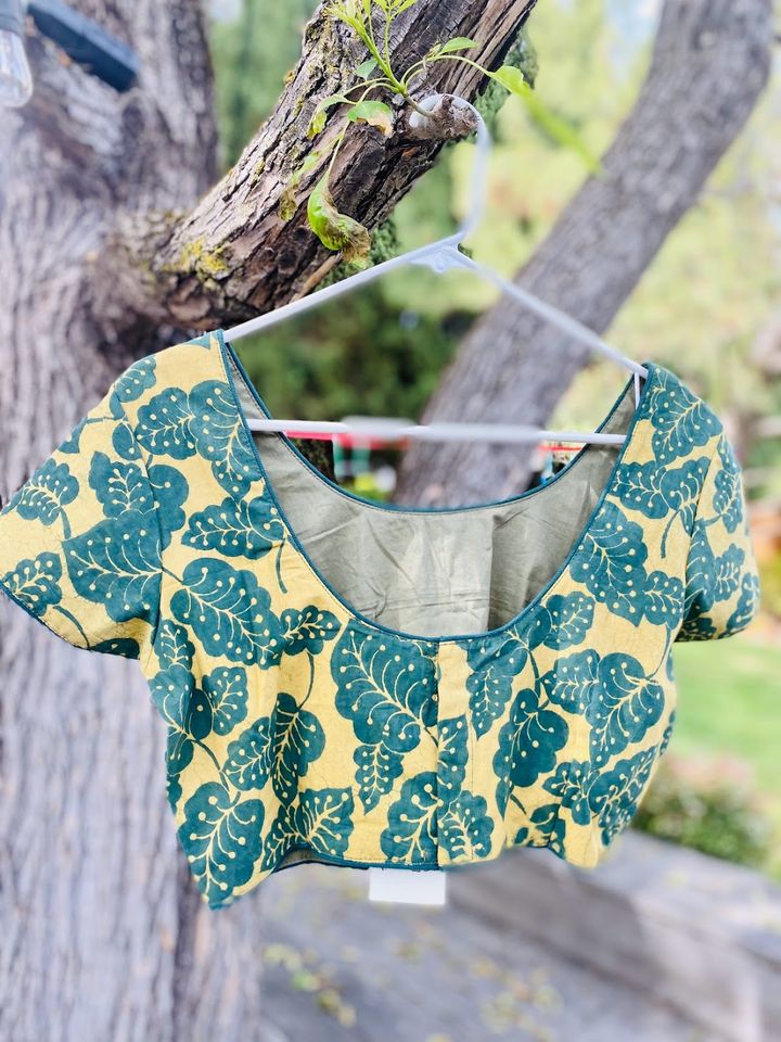 Whimsical Bagru/ Dabu hand block print motifs; pops of colors! These blouses have an elegant cut with contrast piping for a perfect fit & finish!