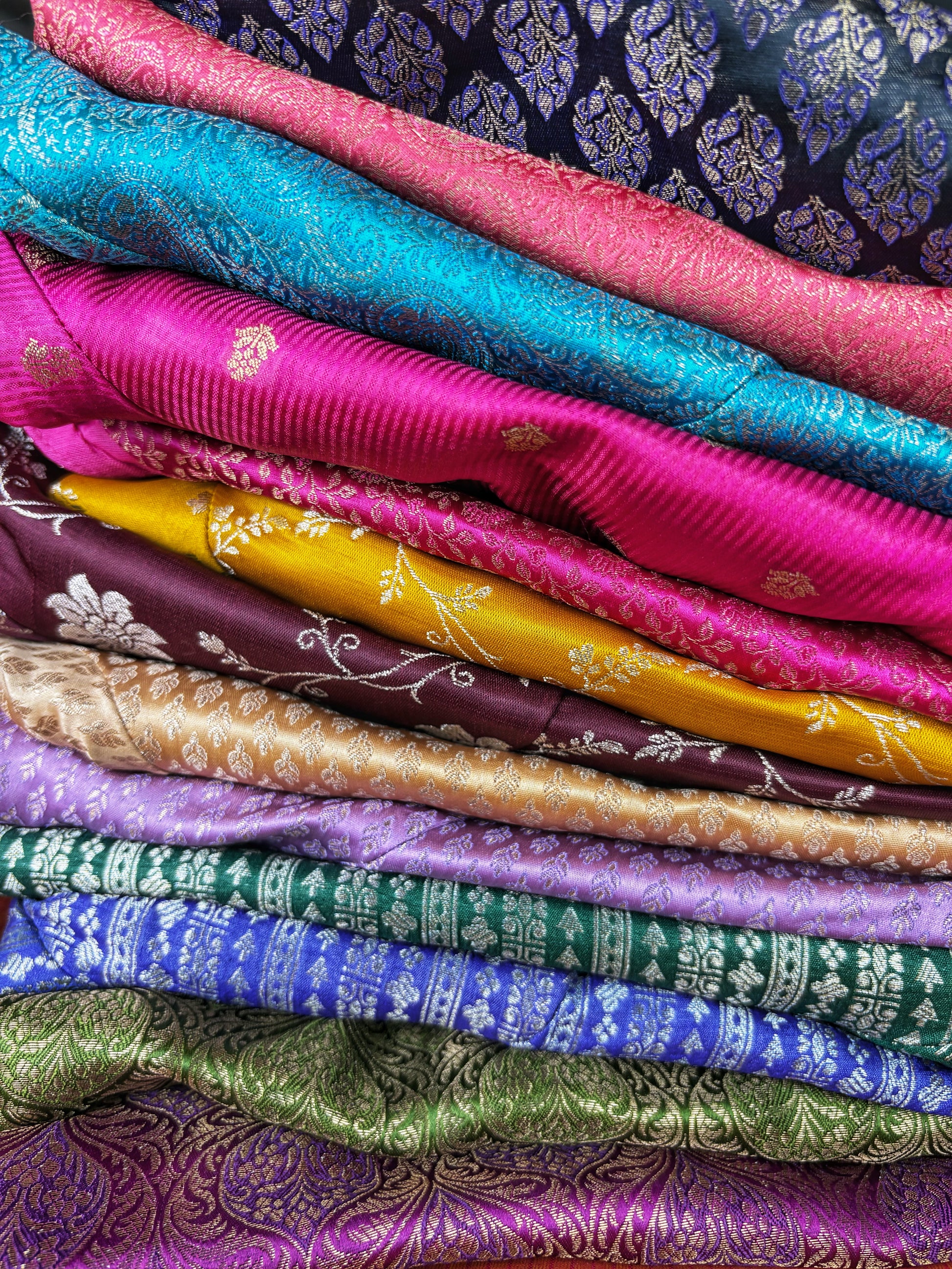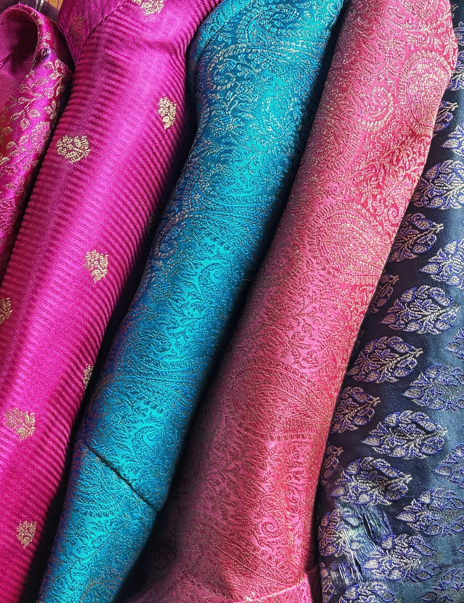 Banarasi brocade is hailed as one of India’s finest fabrics, it is a speciality of Varanasi, the holy town from where it gets its name. One could consider brocade as the equivalent of Jacquard, used widely throughout South East Asia. Traditionally, a special gold or silver thread, known as “zari” is added as an extra weft to weave motifs into the silk fabric. This zari thread is said to be so fine that it could be made into a fabric of gold.