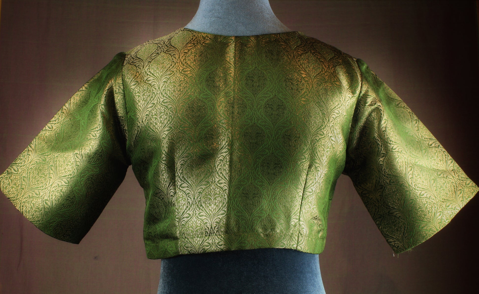 Banarasi brocade blouse with floral motifs all over. Available in Purple and Mehendi green. Affordable, Banarasi brocade blouses in a variety of festive colors! Pairs beautifully with your silk saree collections and super comfortable to wear.