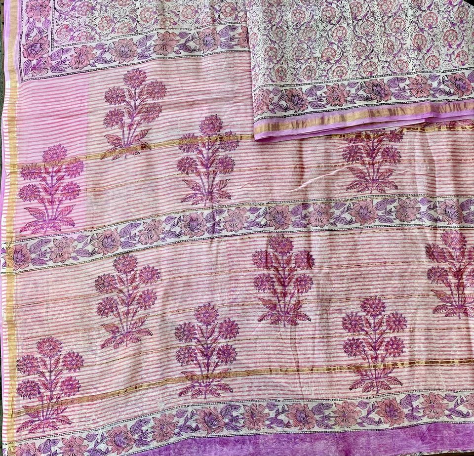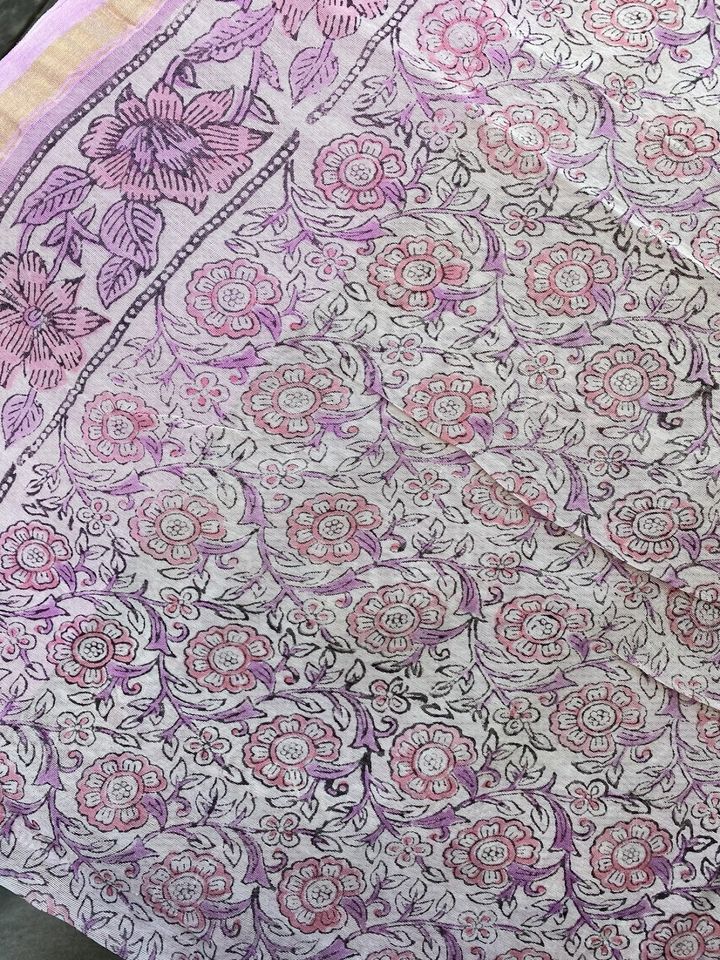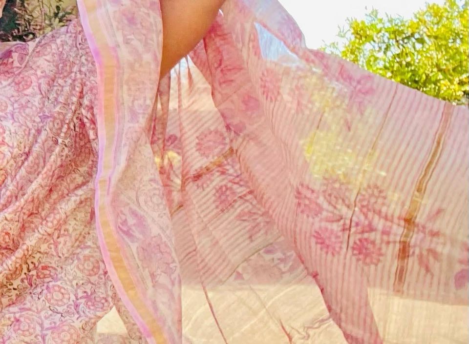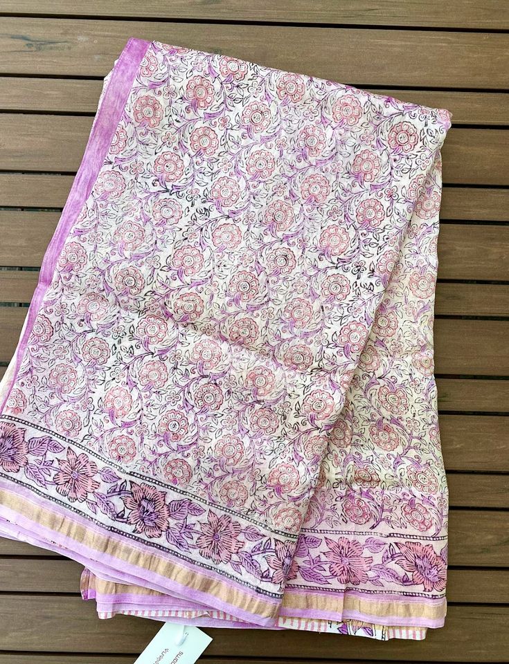 A shimmery saree in White with Bagru/ Dabu floral hand block prints in baby pink. Chanderi silk cotton is light and comfortable to drape!
