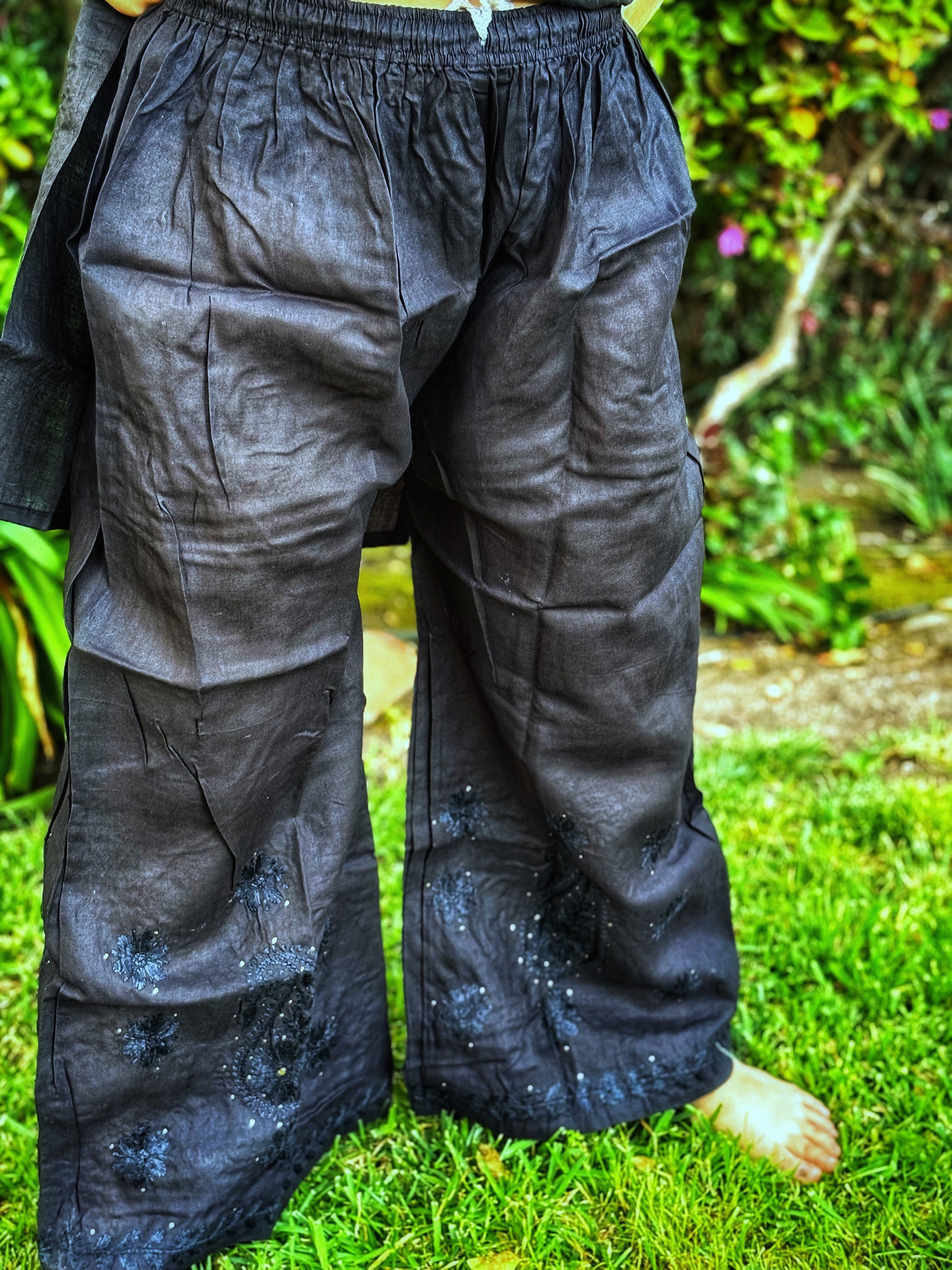 Cool, cotton Kurta sets in White or Black with matching Palazzo pant.  They are hand embroidered with self Chikankari  and Mukaish work . This 2 piece set includes a Kurta and Palazzo pant in matching color.