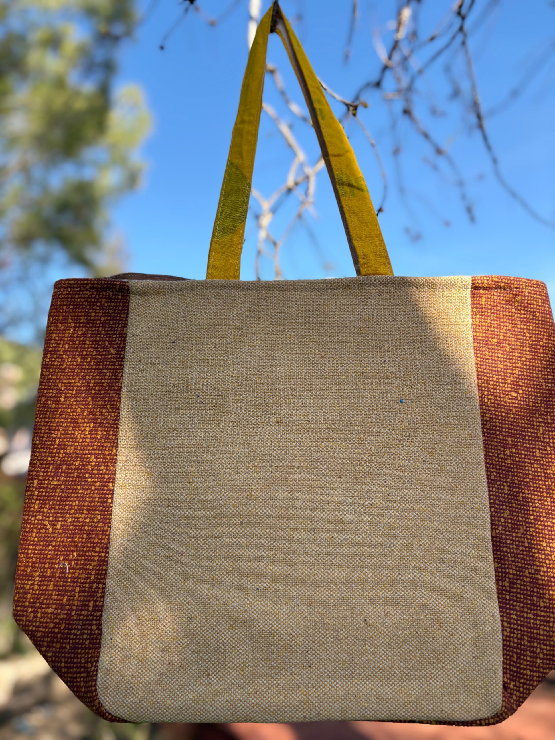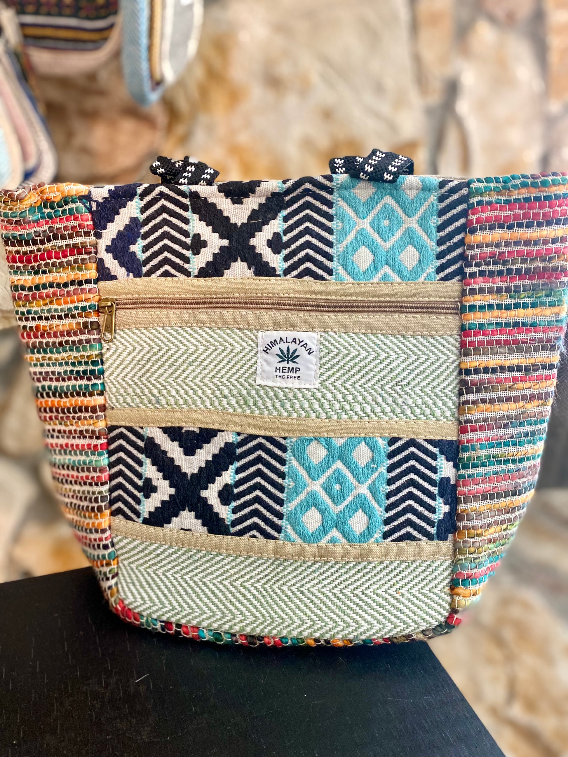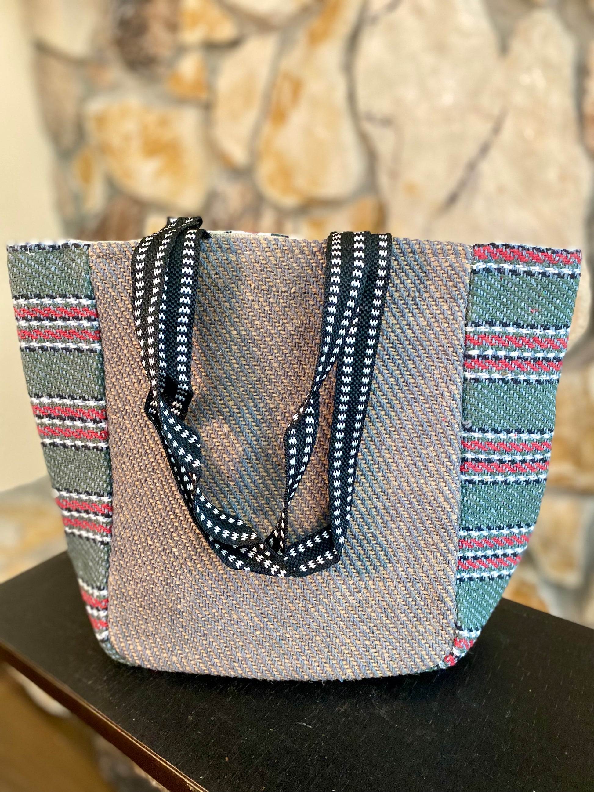 A sustainable tote bag which is also super fun and functional! Attractive patch work of colorful patterns/ tribal designs adorn the front of this tote bag. Colors and designs vary.