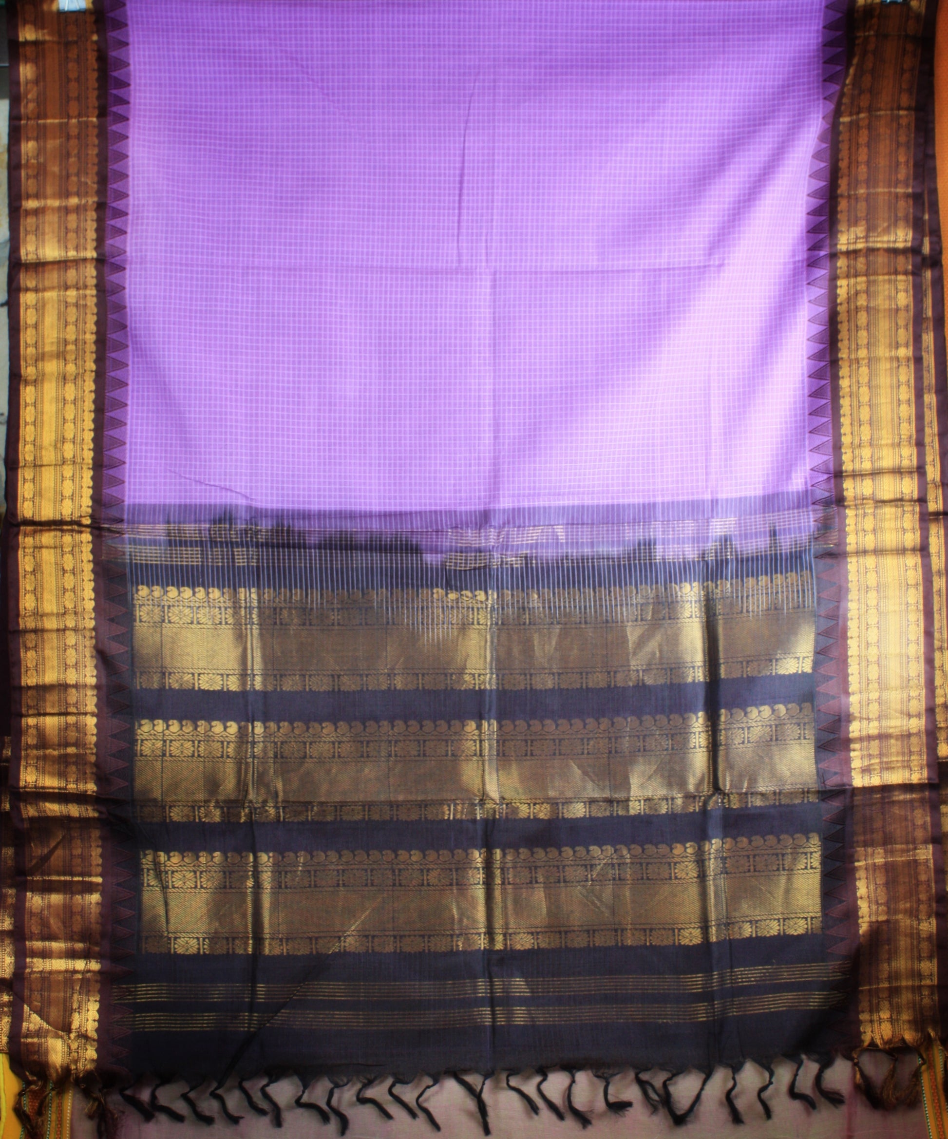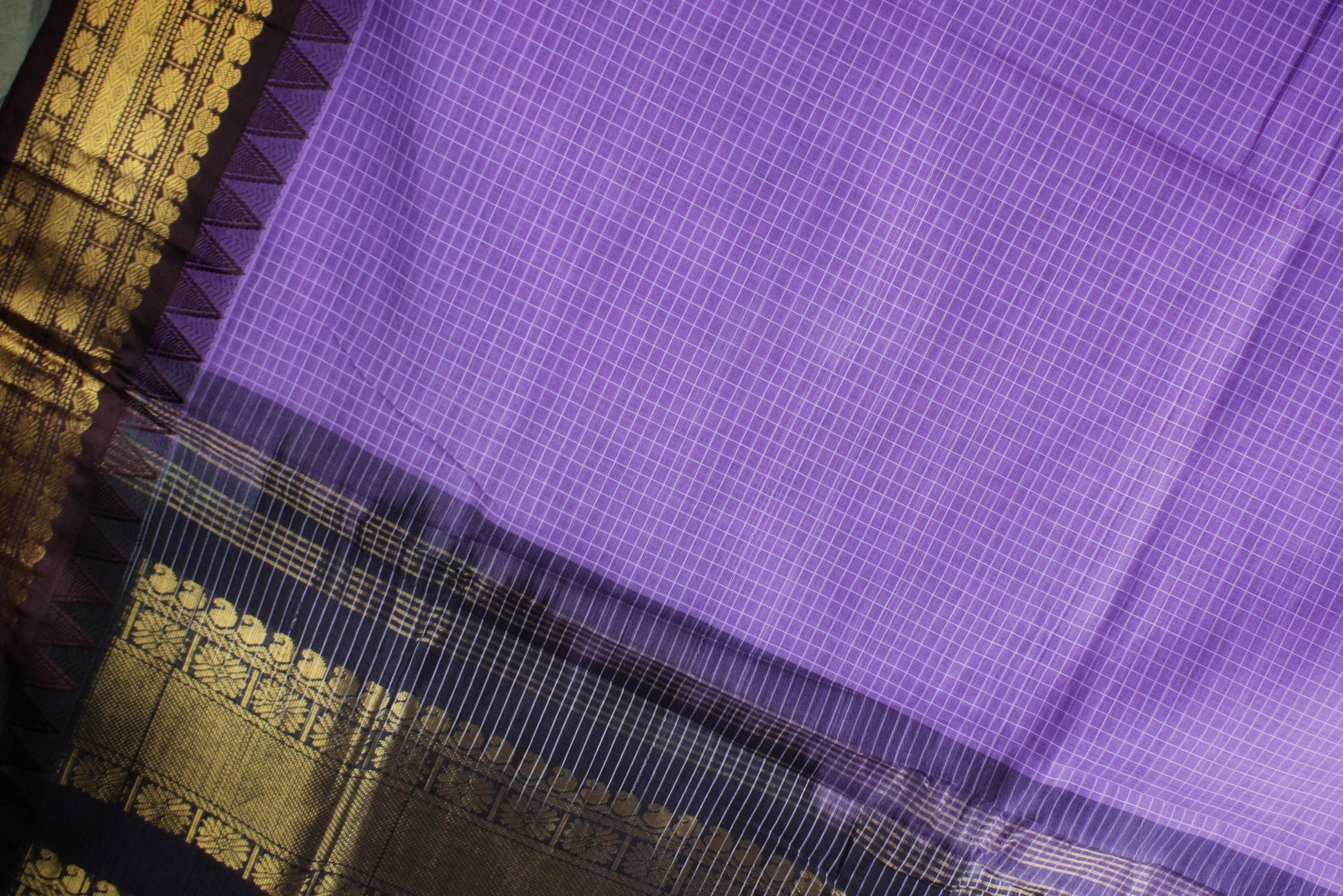 Gadwal Handloom Cotton saree in Lavendar with small checks and beautiful contrast silk Kuttu Kumbam border and Pallu with zari motifs in Brown. Lightweight and easy to drape!