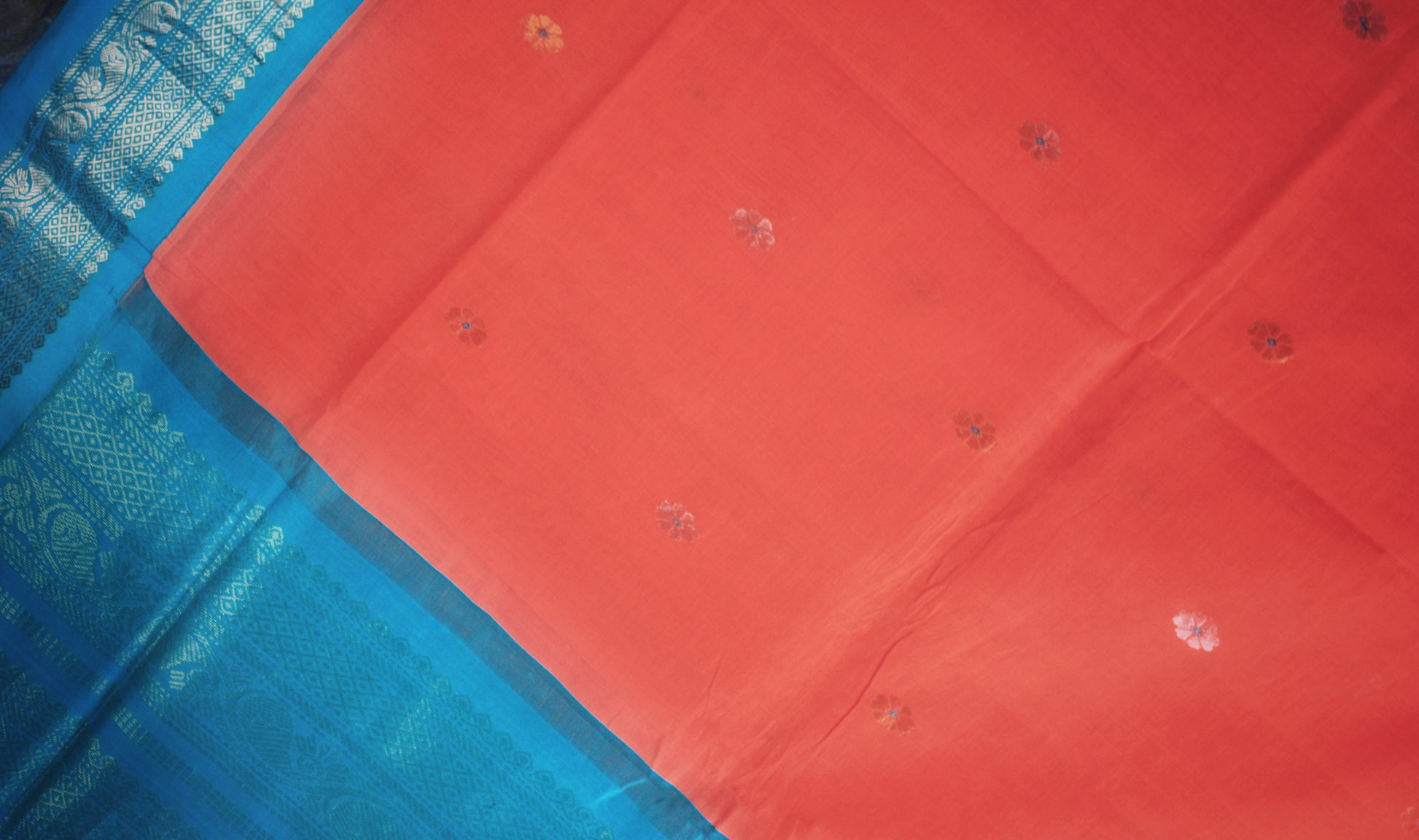 Gadwal Handloom cotton saree in an absolutely delightful color combination. Orange body has pretty, meenakari floral buttas and Turquoise kuttu border and Pallu with intricate zari motifs!