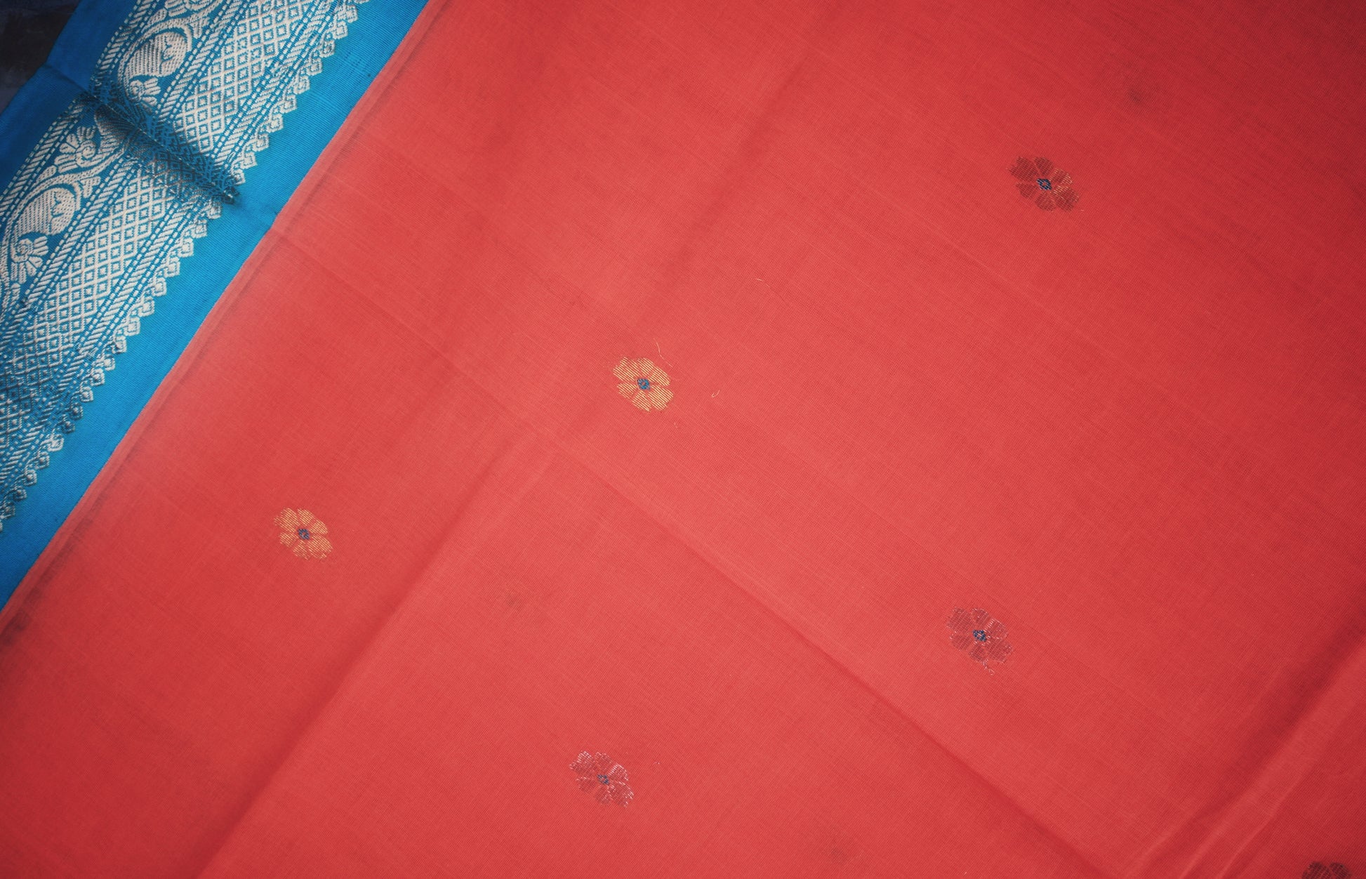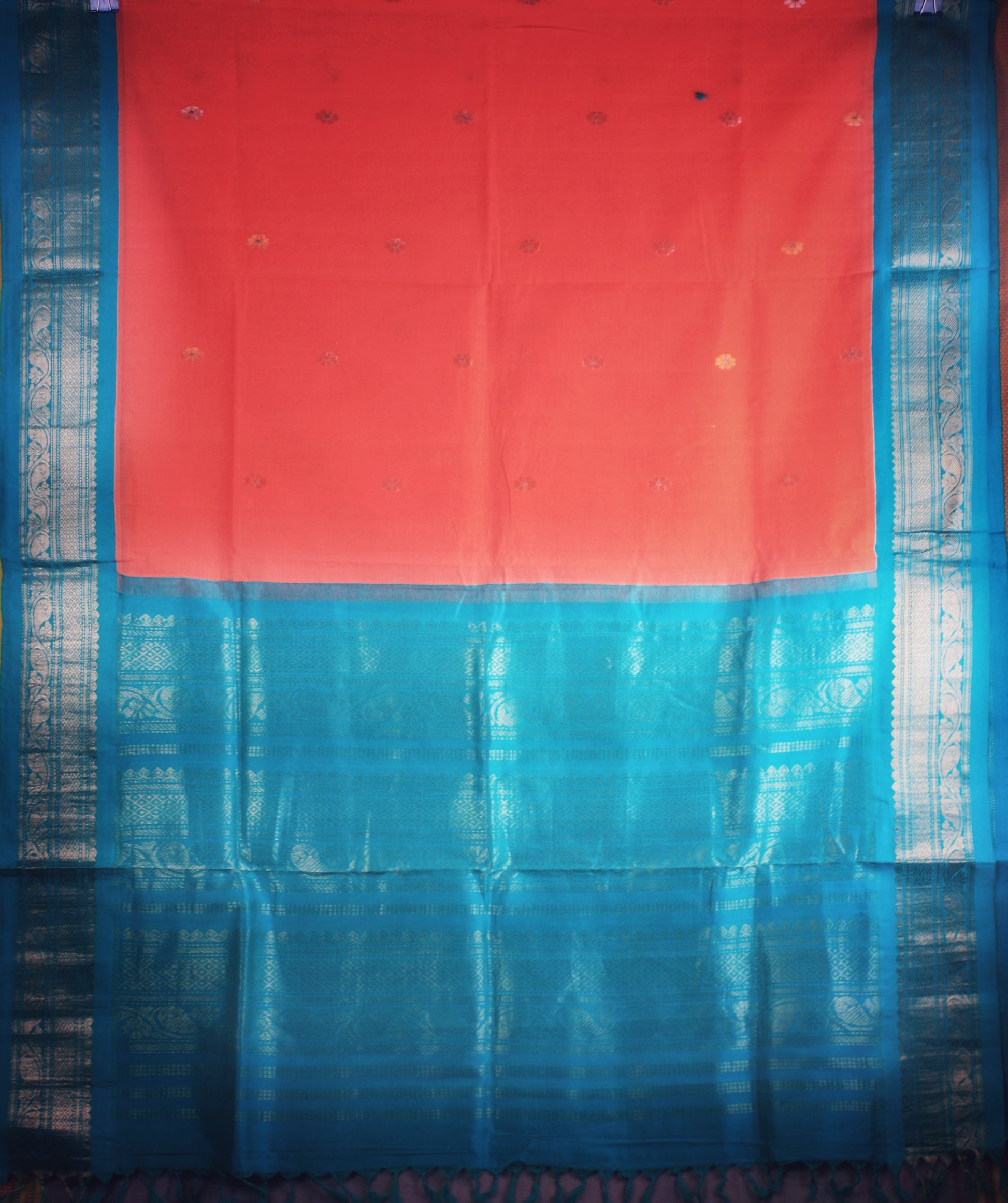 Gadwal Handloom Cotton Saree - Orange/ Turquoise