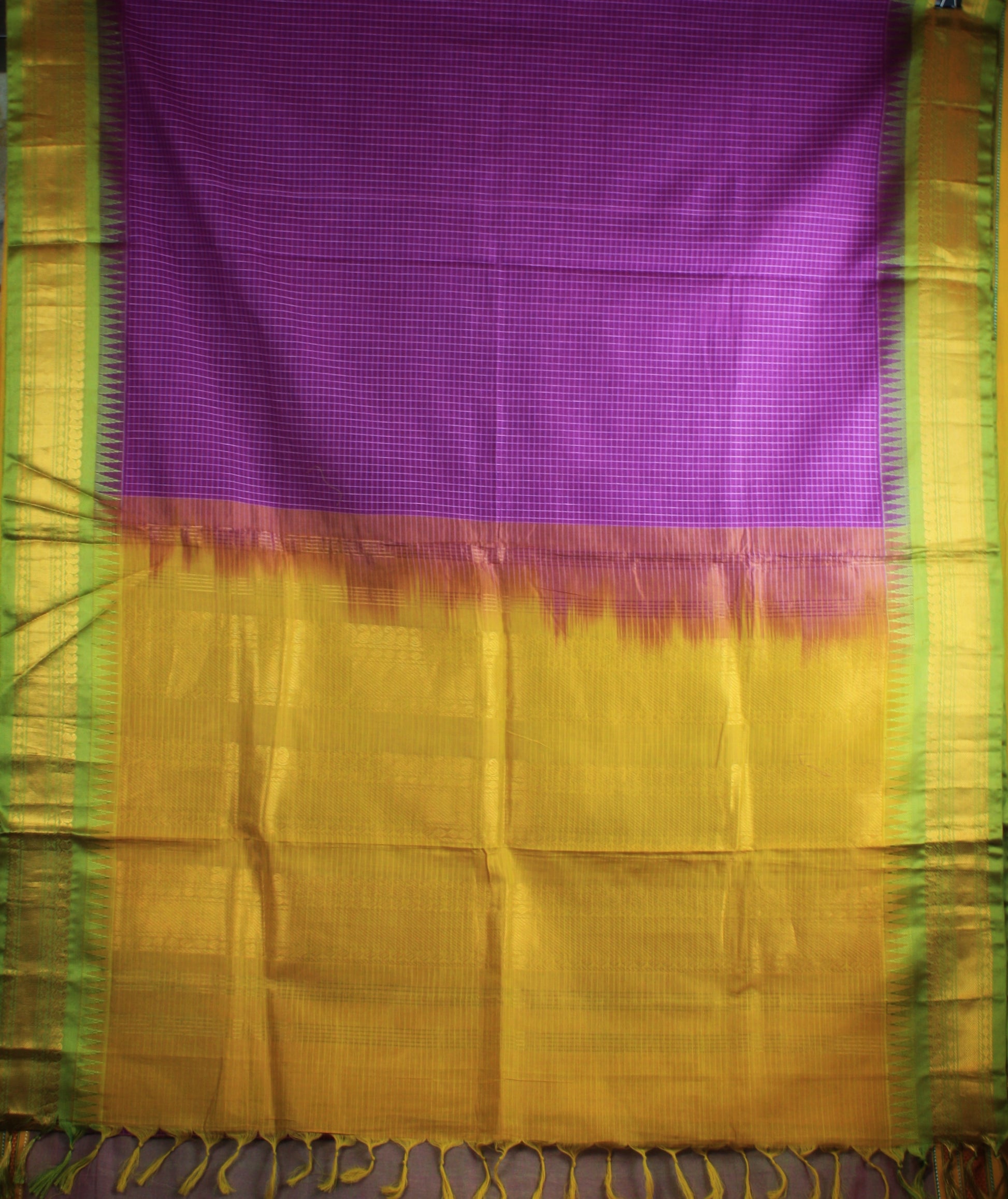 Gadwal Handloom Cotton saree in Purple with small checks and beautiful contrast silk Kuttu Kumbam border and Pallu with zari motifs in Light green. Lightweight and easy to drape!