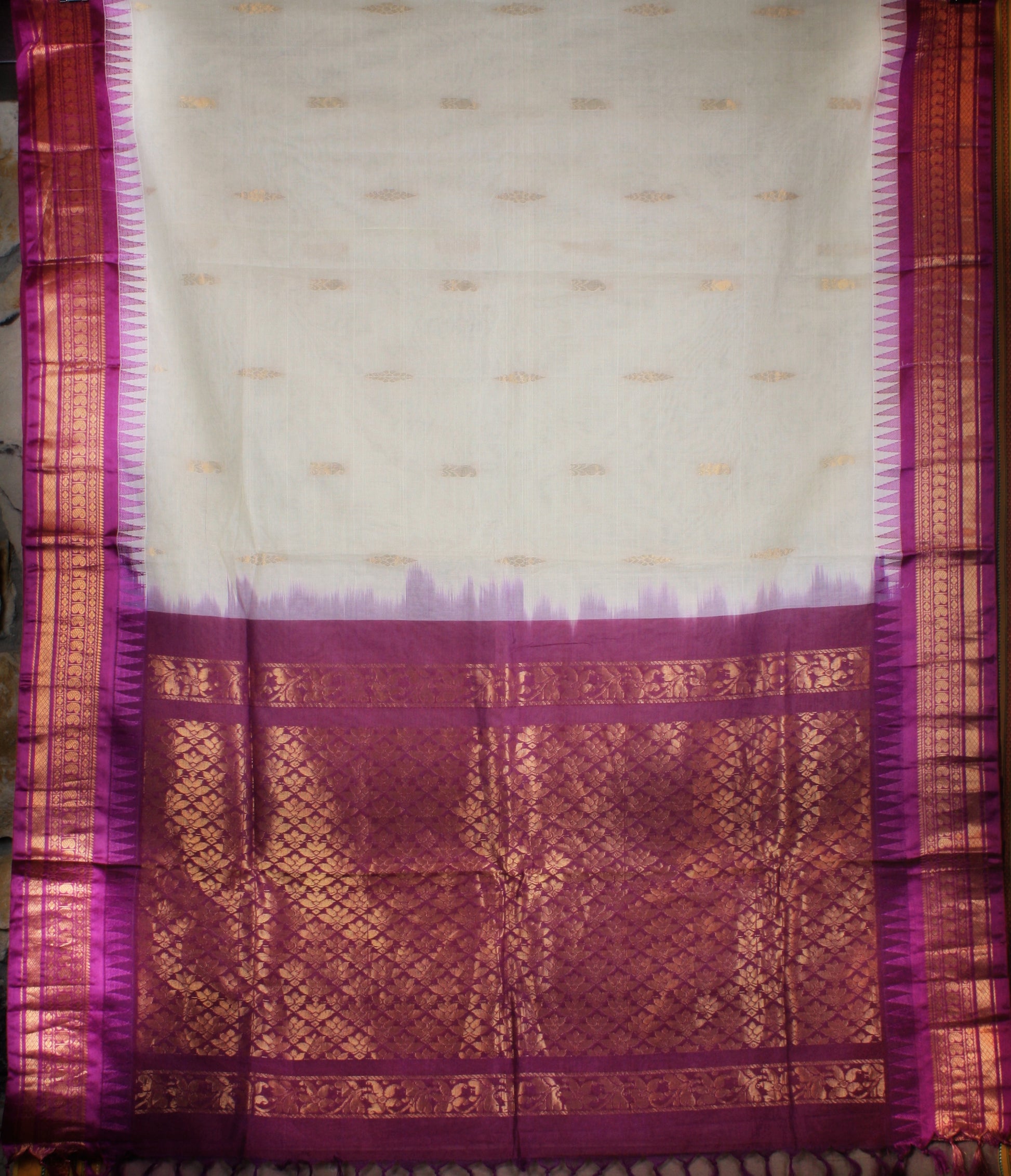 Gadwal Handloom Cotton saree in White with buttas all over and beautiful contrast silk Kuttu Kumbam border and Pallu with zari motifs in Purple. Lightweight and easy to drape!