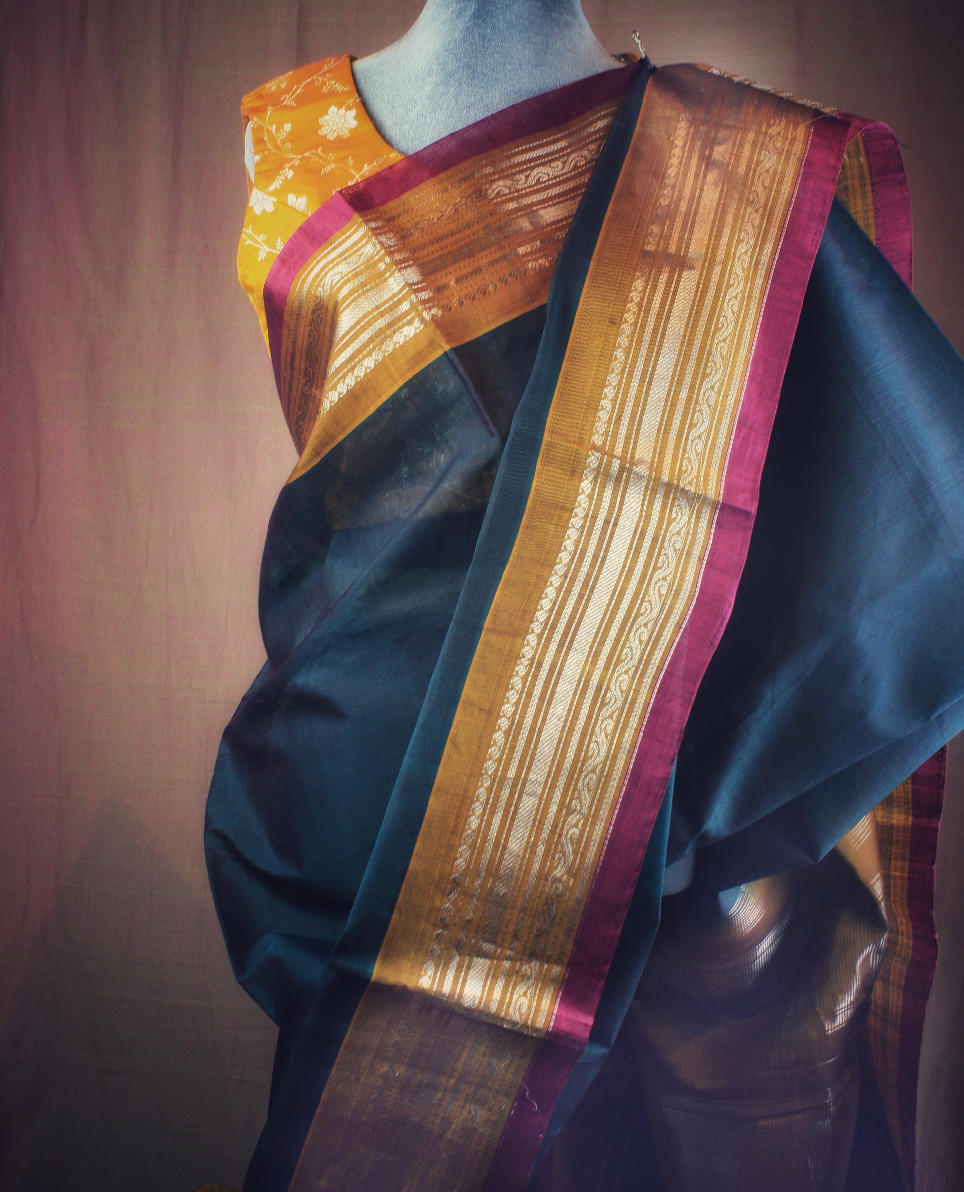 Gadwal Handloom sarees are from the town of Gadwal in Telengana and date back to the 17th century. Typical Gadwal Handloom sarees have a cotton body and silk border and Pallu. They are known for their well- crafted Kuttu borders which are traditionally woven in the interlocked-weft technique (called Kuppadam or Tippadamu locally) and often with Kotakomma (also called Kumbam) in the borders. This allows for borders and Pallus to be woven separately and then attached during weaving resulting in beautiful contrast color combinations.The skilled weavers of Gadwal hold the rare honor of creating the “Sesha Vastram” for Lord Venkateswara during the annual Brahmotsavam festival in Tirupati.