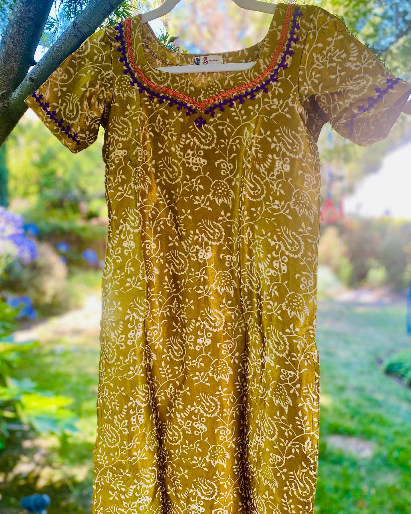 Mashru handloom Girl's kurta in Gold color is luxurious and comfortable and is embellished with Hand block print and Kutch hand embroidery along the neckline in contrast colors!