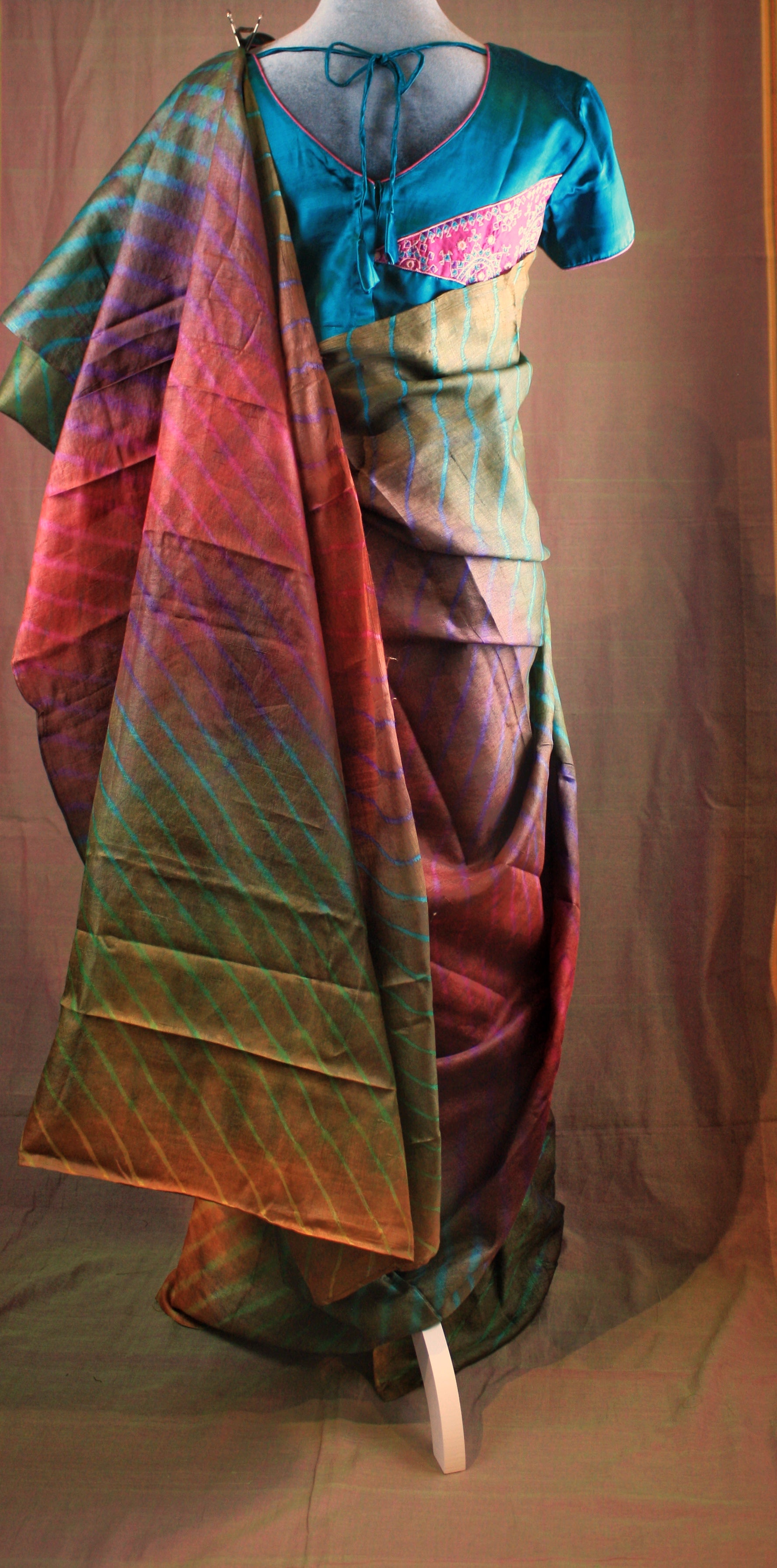 This hand crafted Leheria tie-dye saree a multi -color background with vertical bands of Yellow, Green, Brown and Dark Pink! The mesmerizing diagonal wavy lines are in vivid colors that change throughout the saree. What a stunner!