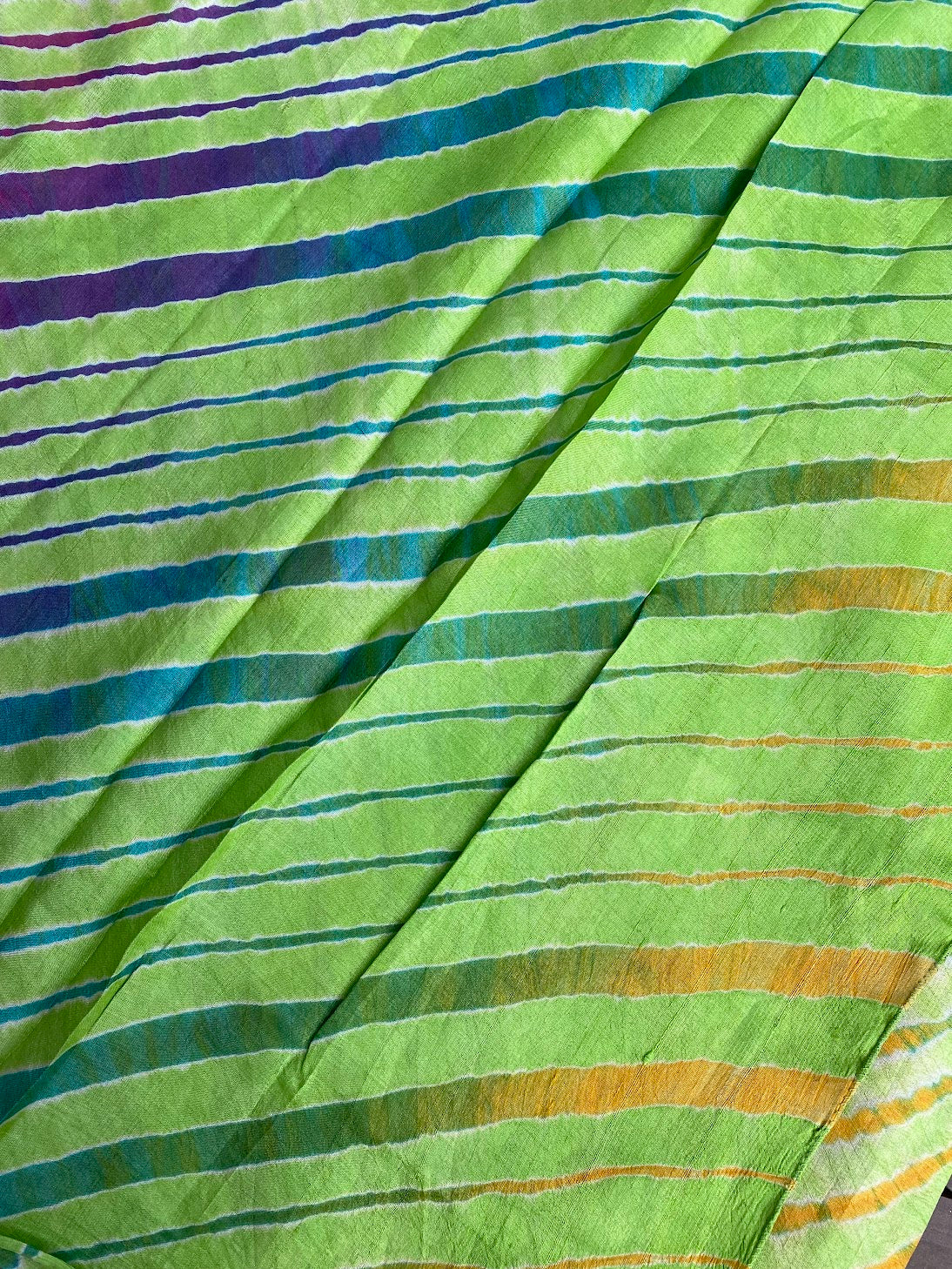 Leheria is an 800 year old traditional style of tie dye practiced in Rajasthan, India that results in brightly colored and mesmerizing wavy patterns.The fabric is rolled diagonally, and then tied at the required intervals and dyed. Wave patterns result from folds made before dyeing. This Leheria saree is tie-dyed by Badshah Miyan, an award winning master crafts family of traditional Rangrez, or textile dyeing craftsmen in Jaipur, Rajasthan. They take pleasure in experimenting with new fabrics and techniques, blending their aesthetic and imagination with the traditional knowledge of their craft.