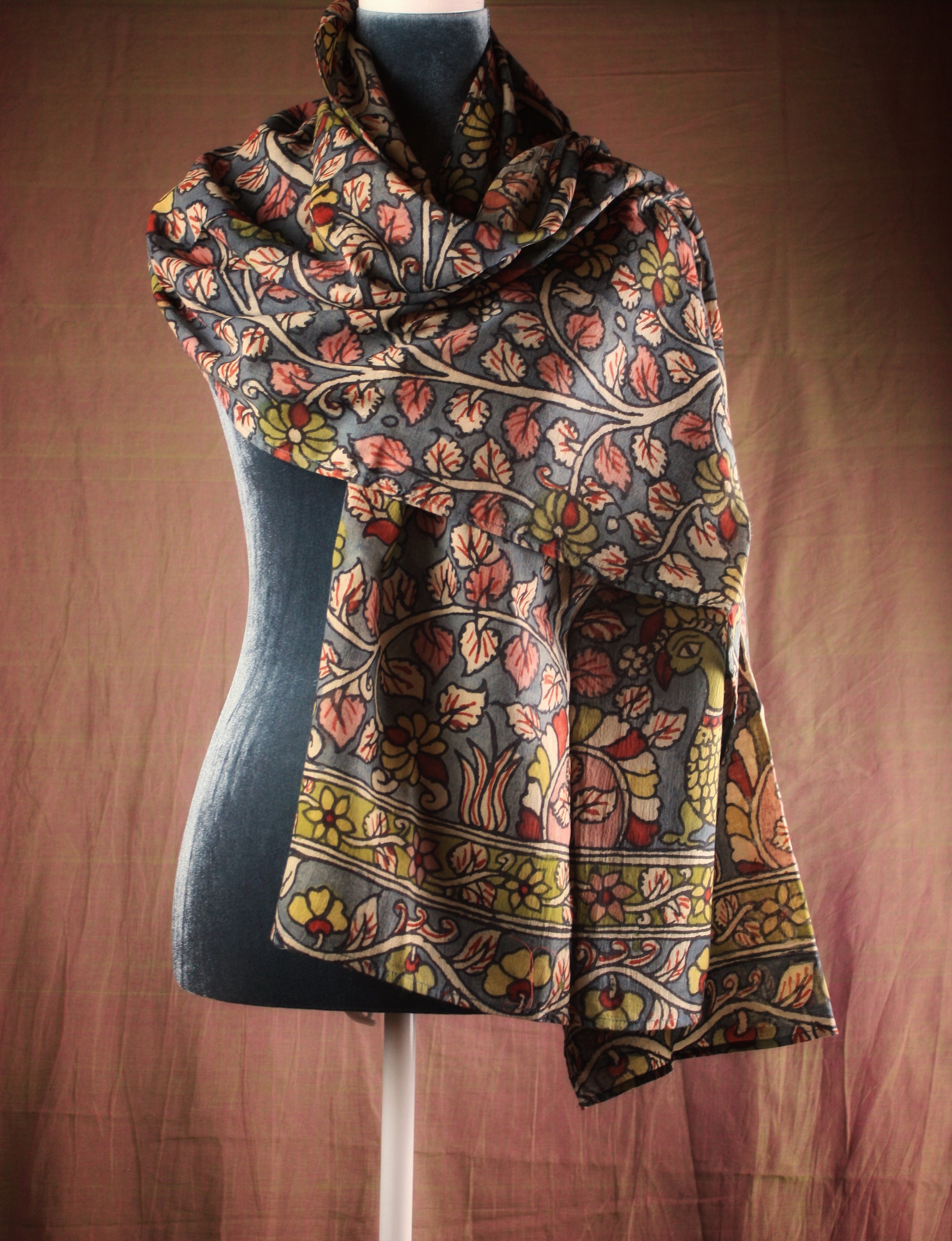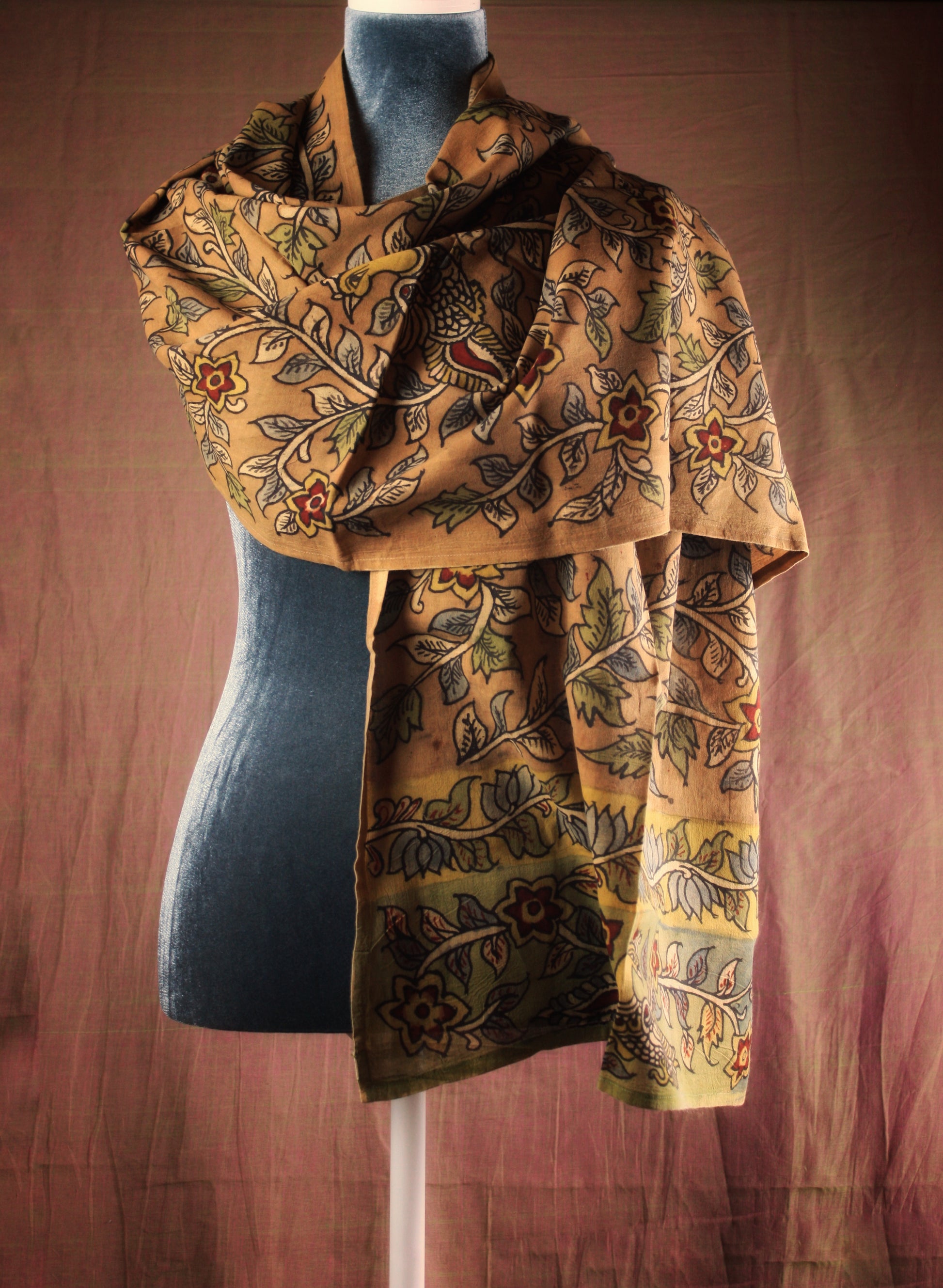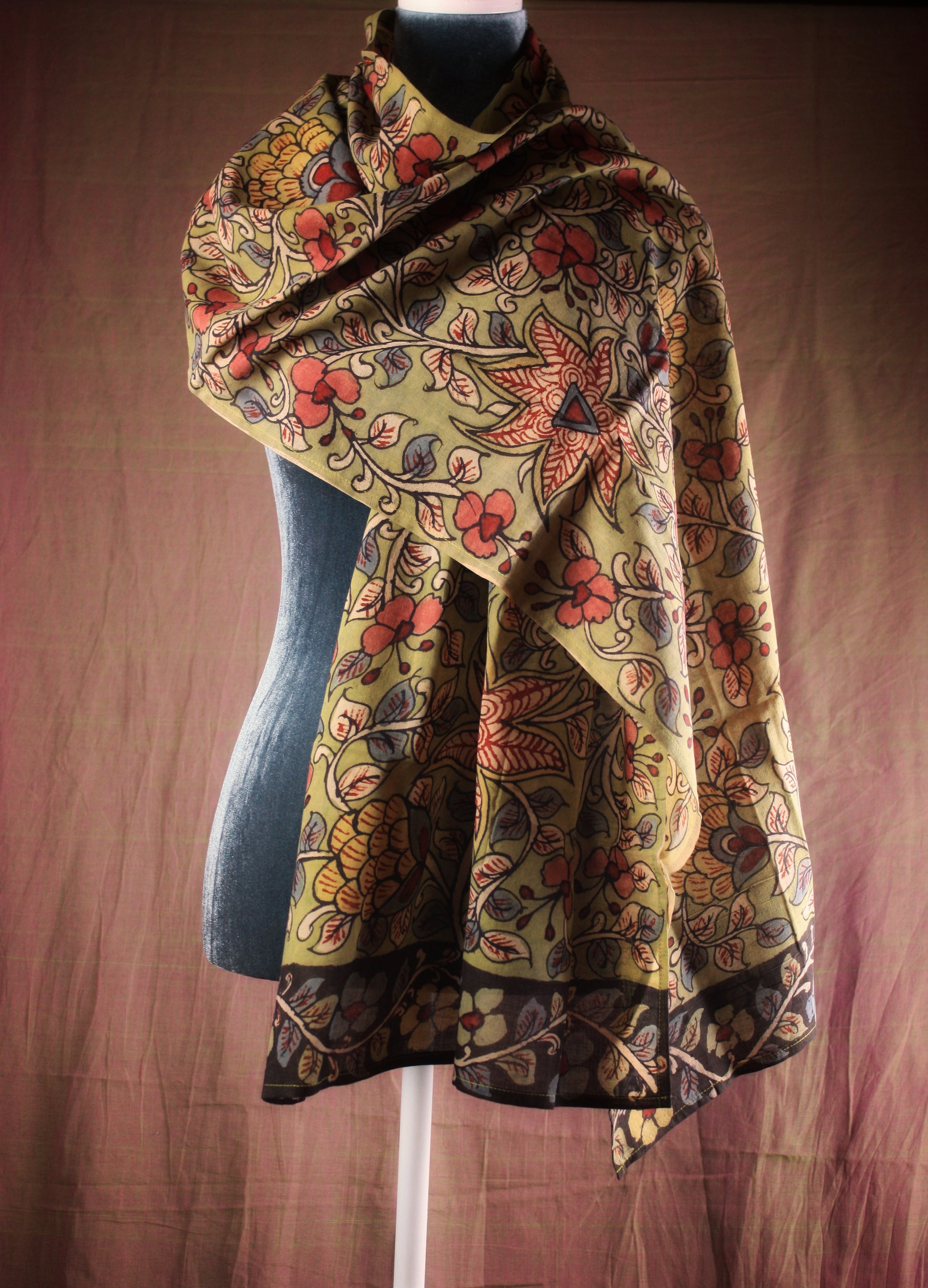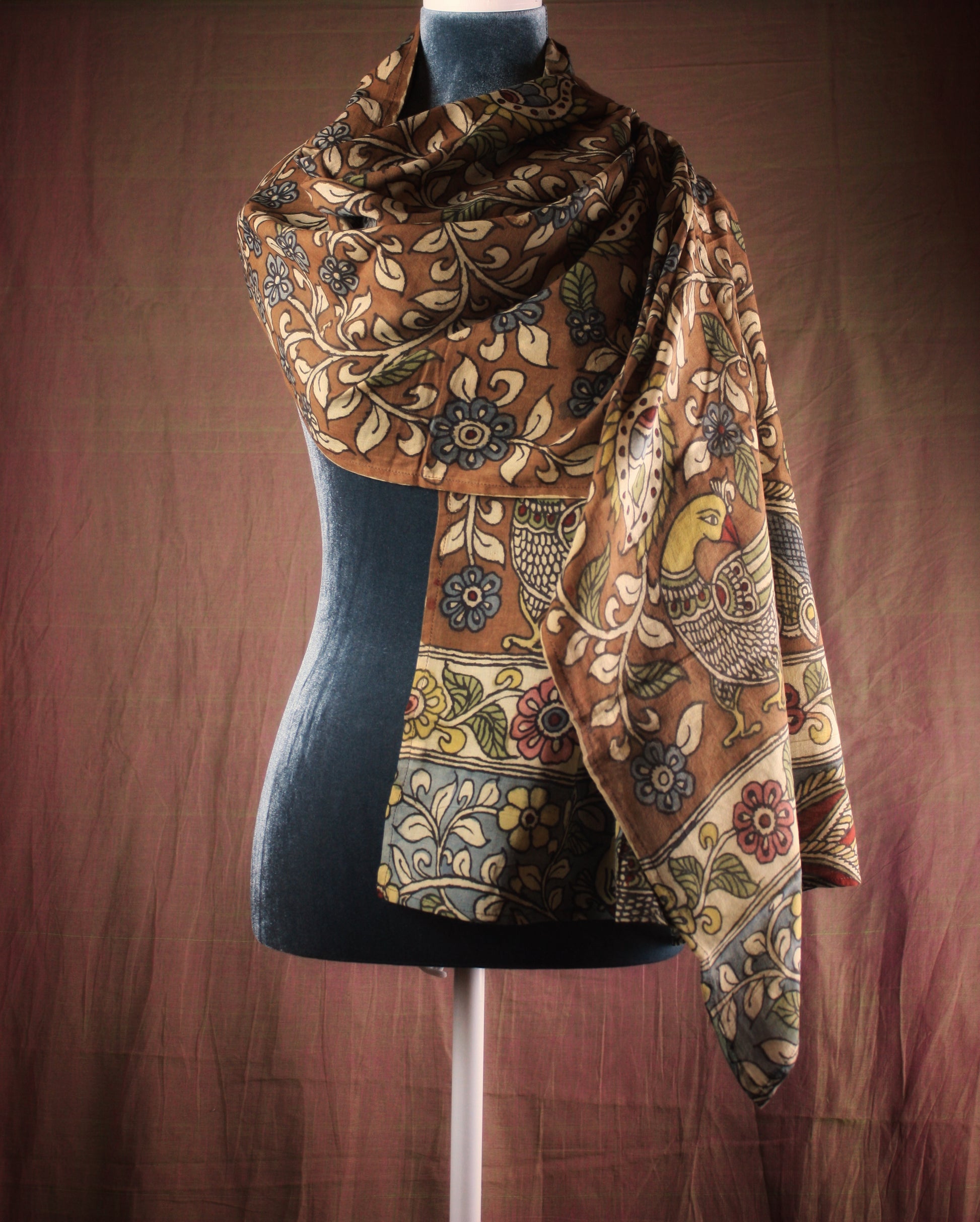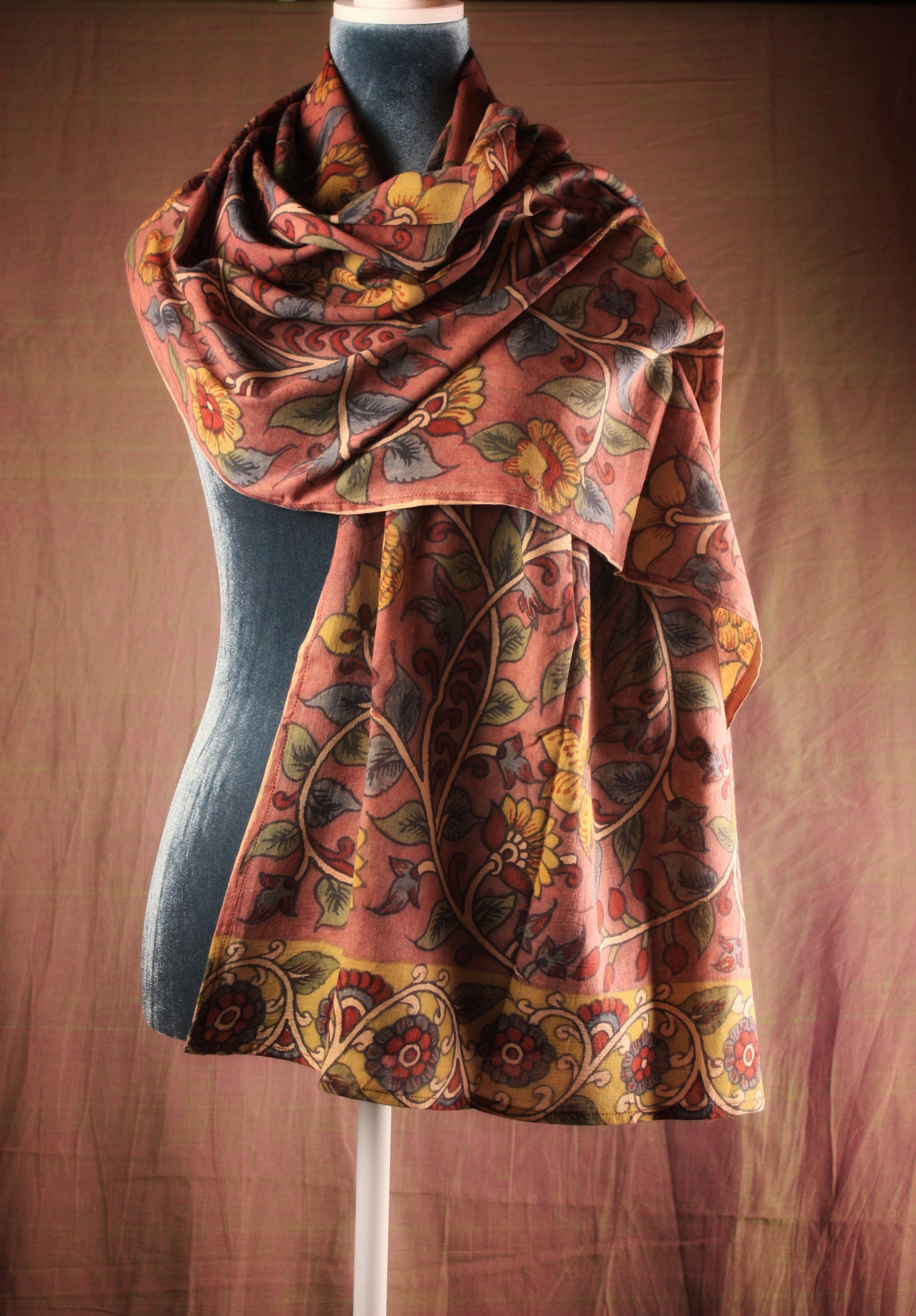 Hand painted kalamkari stole with floral motifs in muted, earth tones. Elevate your outfit by simply adding this stunning stole! Designs vary.