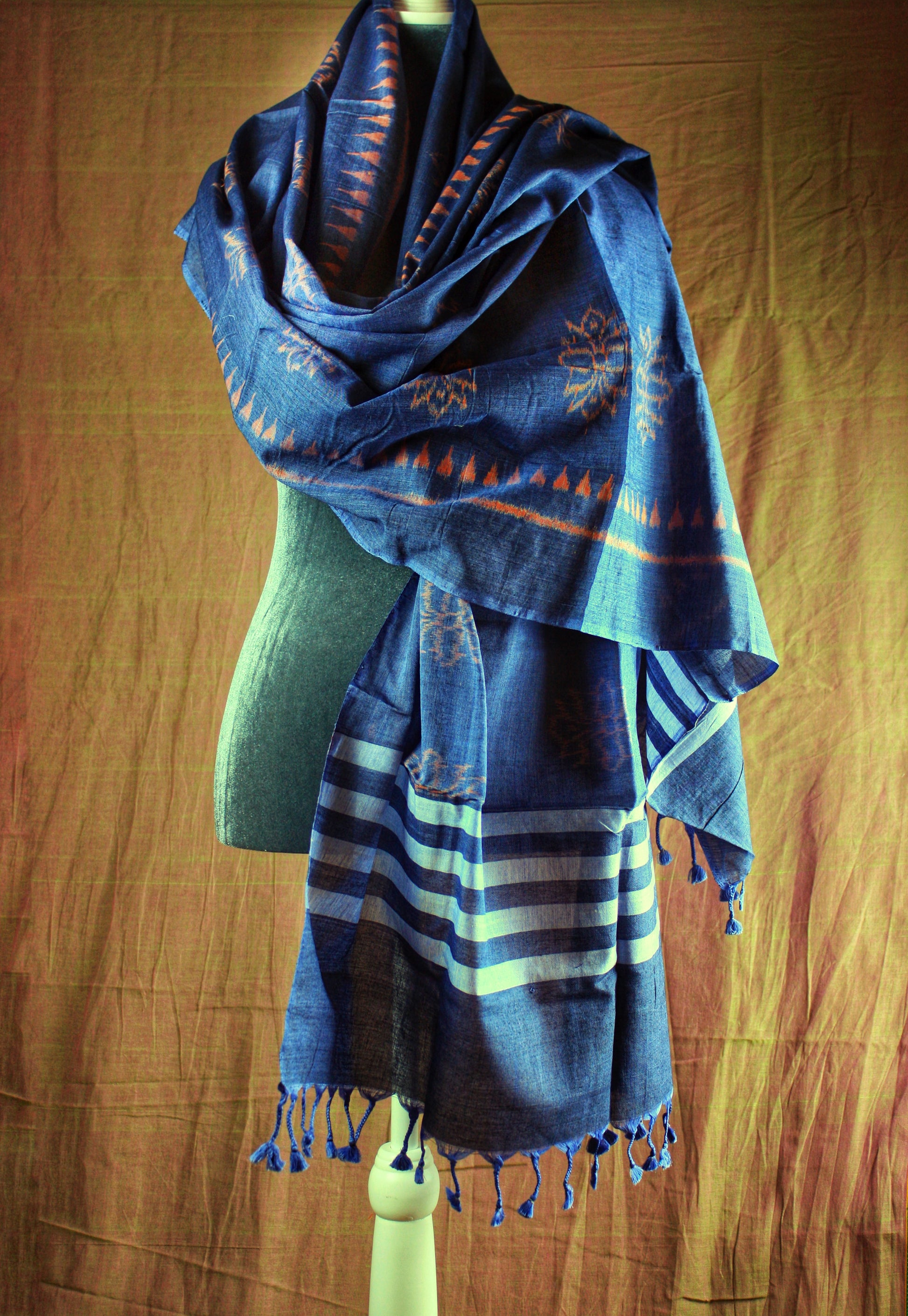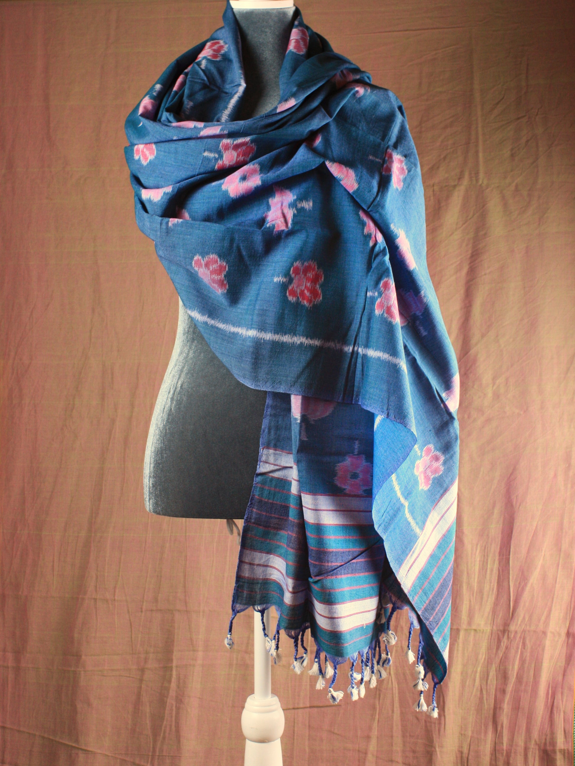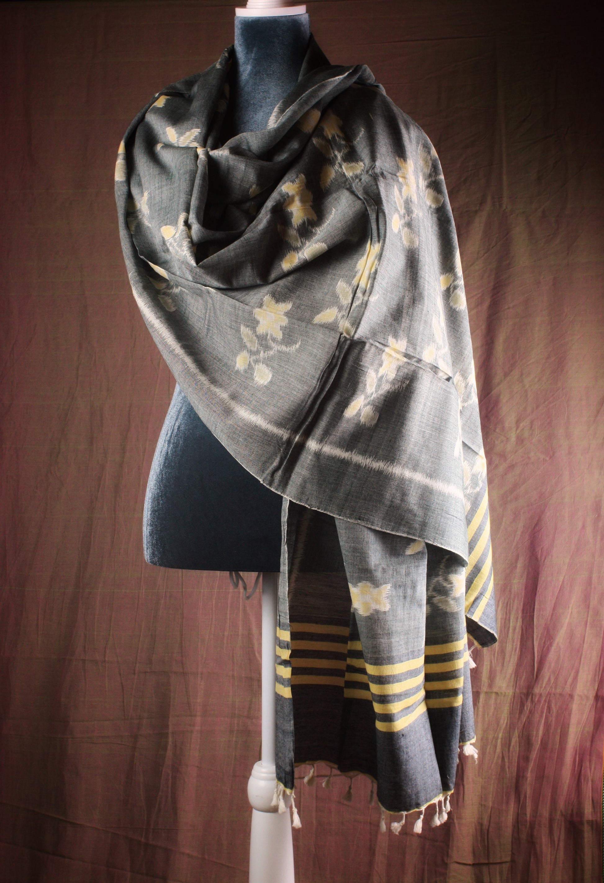 Beautiful floral and geometric motifs created by tie-dyeing the yarns in Ikat technique. Soft cotton dupattas ( shawls) in muted colors can be paired with any outfit to add  "hand crafted" uniqueness to your style!