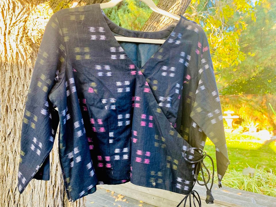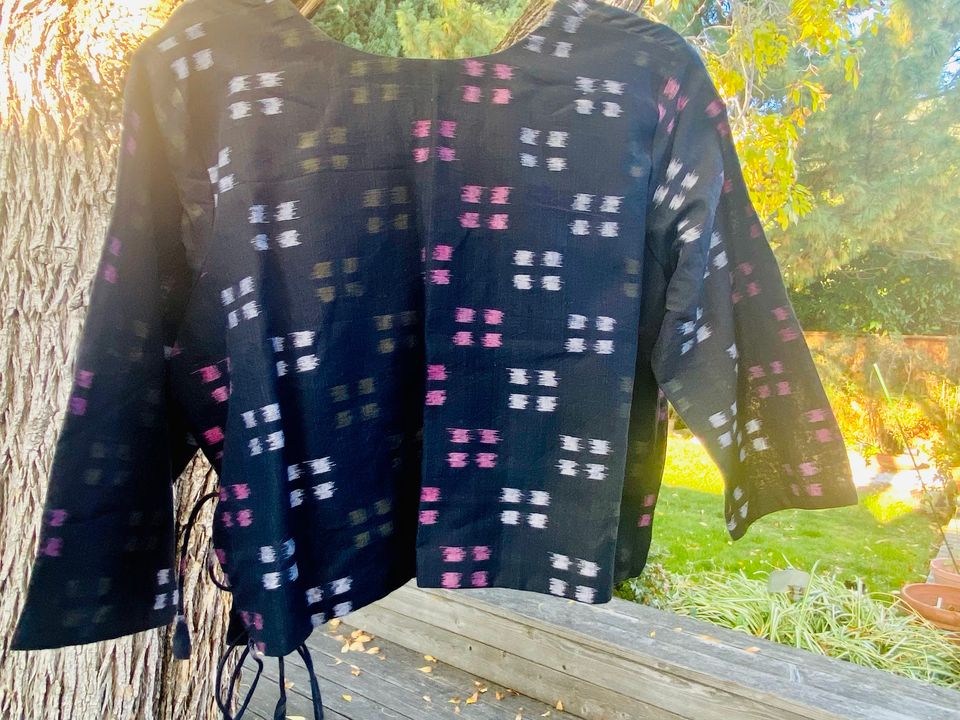 Khandua Handloom Ikat crop top - wrap front; ties, side zipper, 3/4 sleeves. Material: 100% Cotton Source: Available in Black w/ white & pink motif. This fabric was sourced from Maniabandha, Odisha. Weaver: Bikash Mahapatra