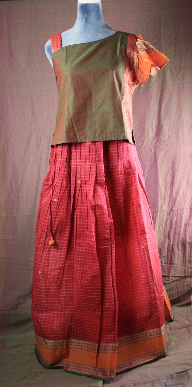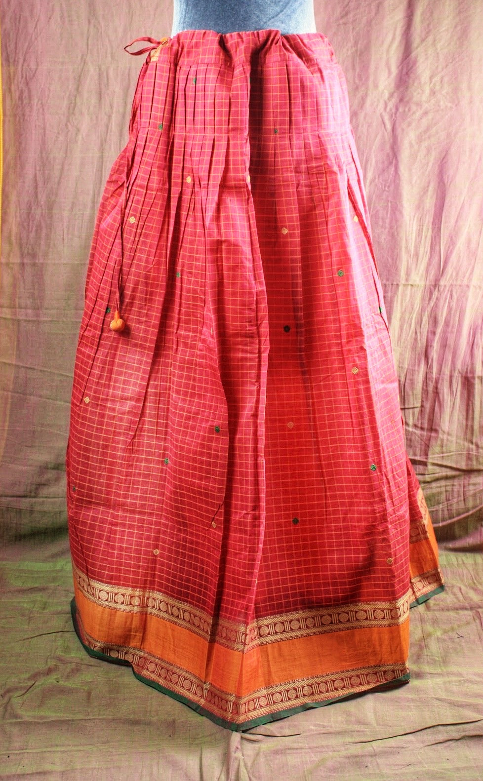 This traditional pavadai (full skirt) has Muthu kattam ( small checks) or Plus (+) motif all over the body and a broad rettai pet border. One size fits all. Pair it with our Kanjivaram crop tops (sold separately) or saree blouse / dupatta (sold separately) for a half saree outfit.