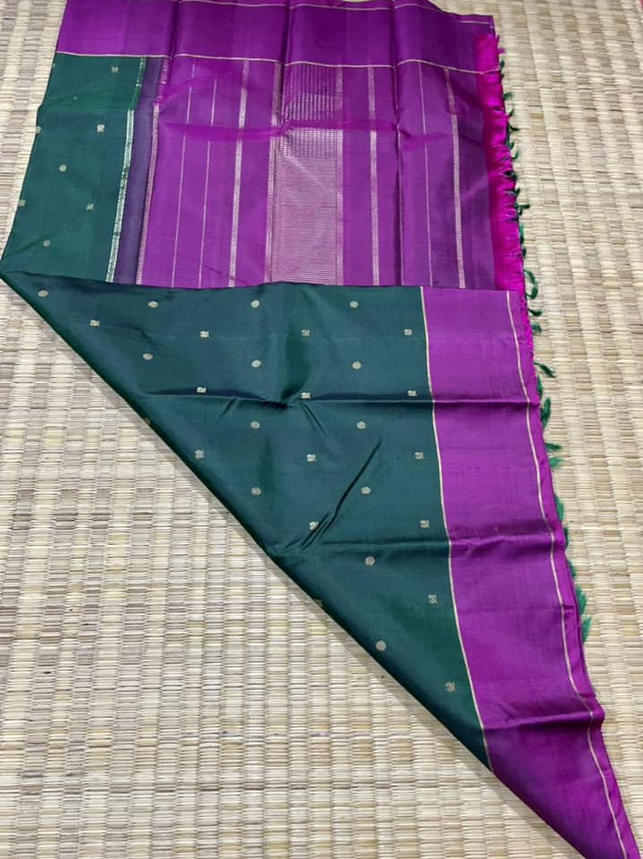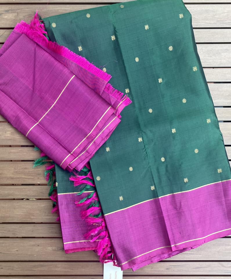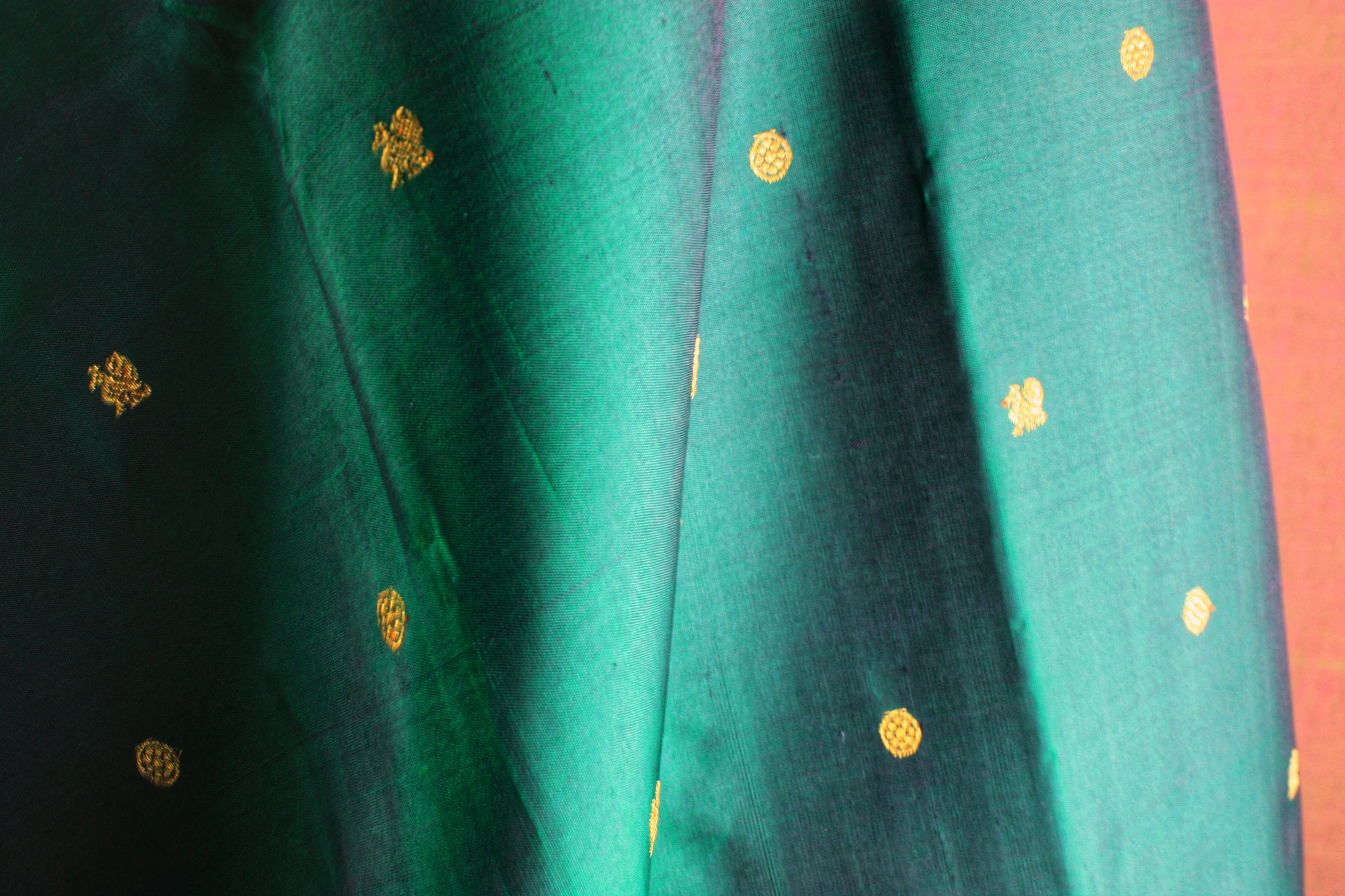 Dainty little Mayil and Chakram motifs in pure zari shine in the Bottle green color background! A classic color combination; precise little motifs, traditional zari seeppu reku pallu. A quintessential Kanjivaram Handloom saree!
