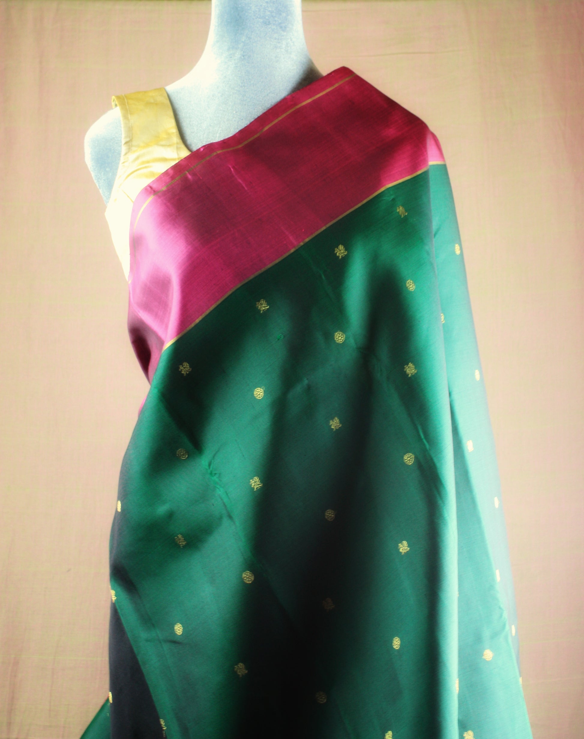 • Body: Bottle green with small mayil (peacock) and chakram (wheel) motifs in zari all over the body of the saree.