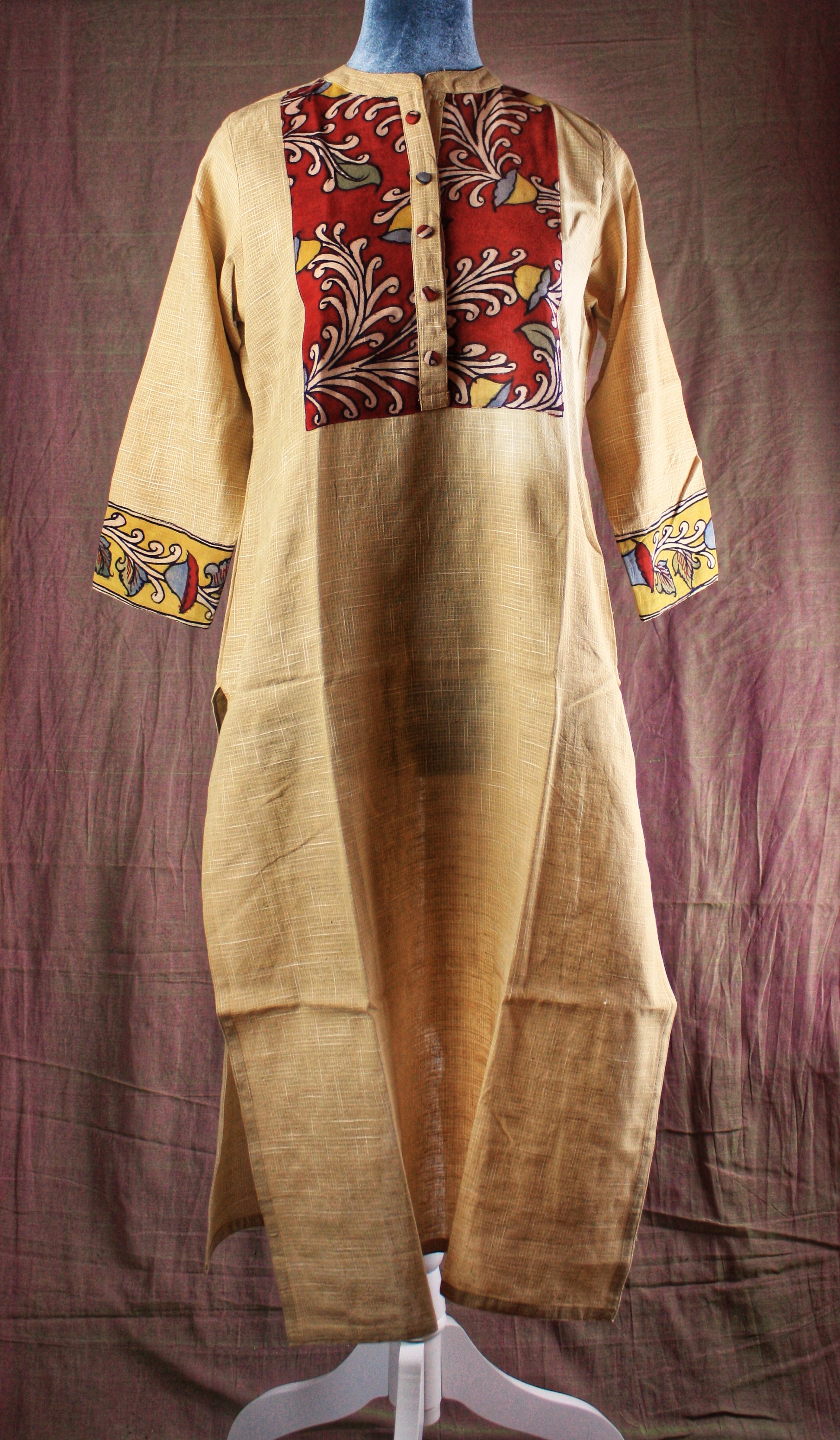 Wear this breezy khadi kurta with eye catching Hand painted Kalamkari yoke in a contrast color. Designs and motifs on the yoke may vary. No two fabrics are alike.