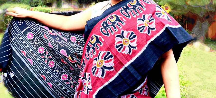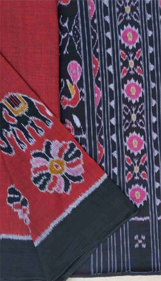 Beautiful, precise and bold Elephant , Peacock and floral motifs created by tie-dyeing the yarns in Ikat technique. Red and Black combination is eye catching! These are soft and quite comfortable to drape!