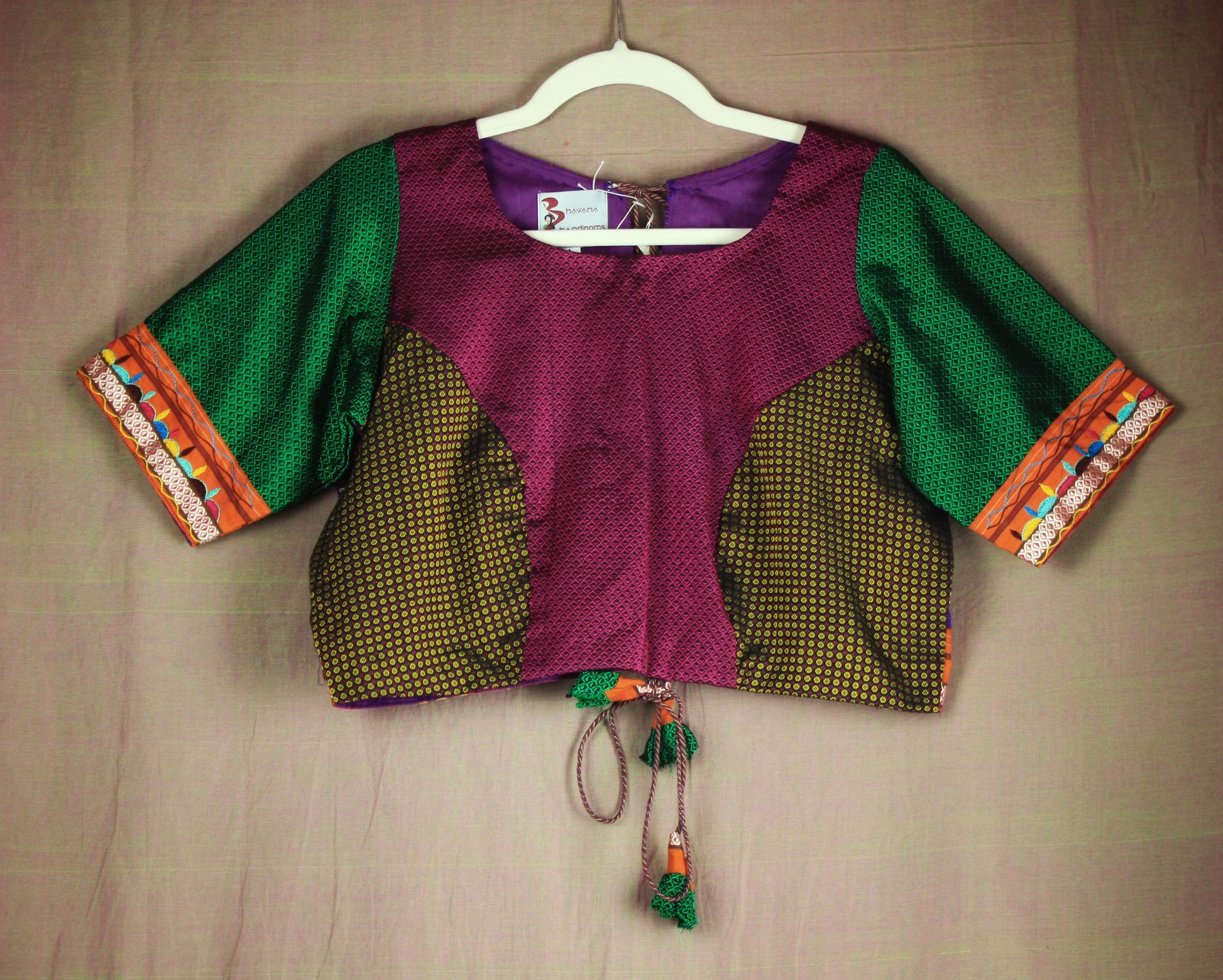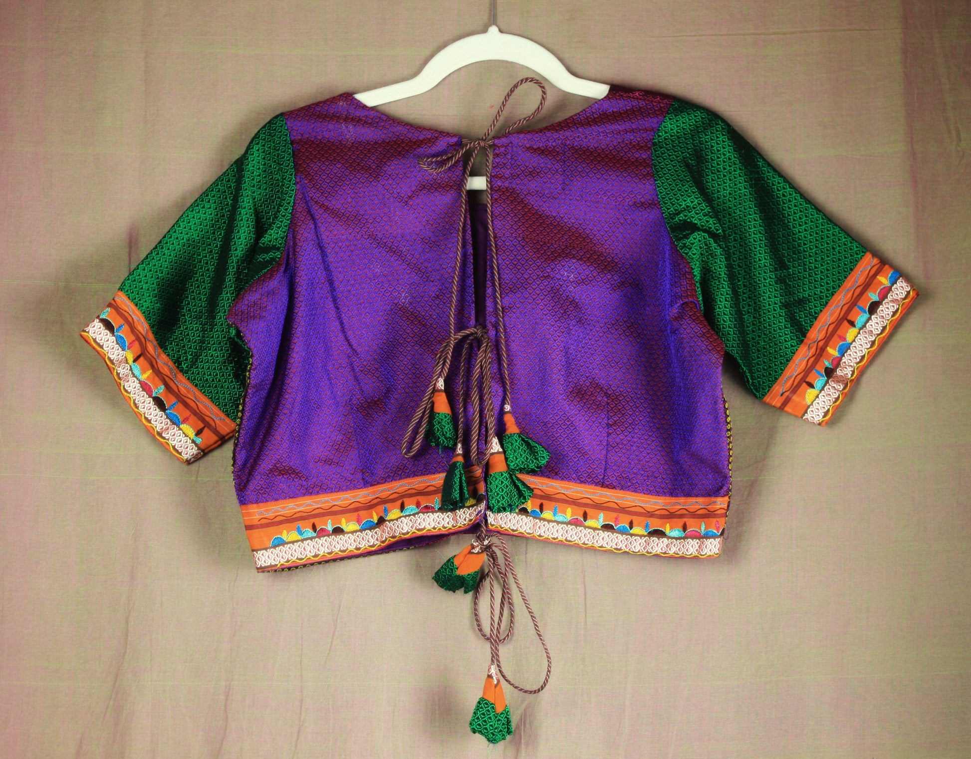 Vibrant,  jewel toned Khun blouse in multi-colors of Green and Purple enhanced with colorful lambani hand embroidery. The textures, double shades and brilliant shine of the khun fabric gives this blouse a rich and luxurious feel!