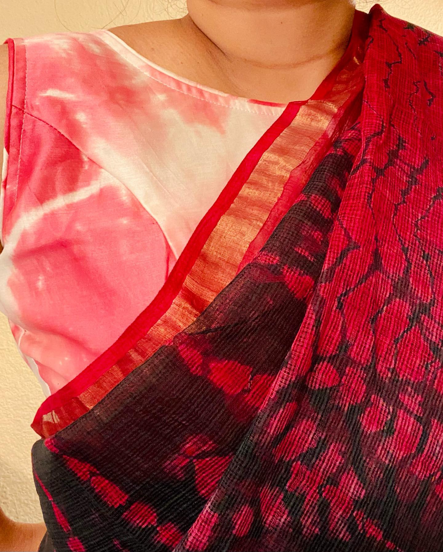A wispy cotton saree, light as air with Shibori dye. Perfect for summer days, in Gray/ Fuchsia color combination!