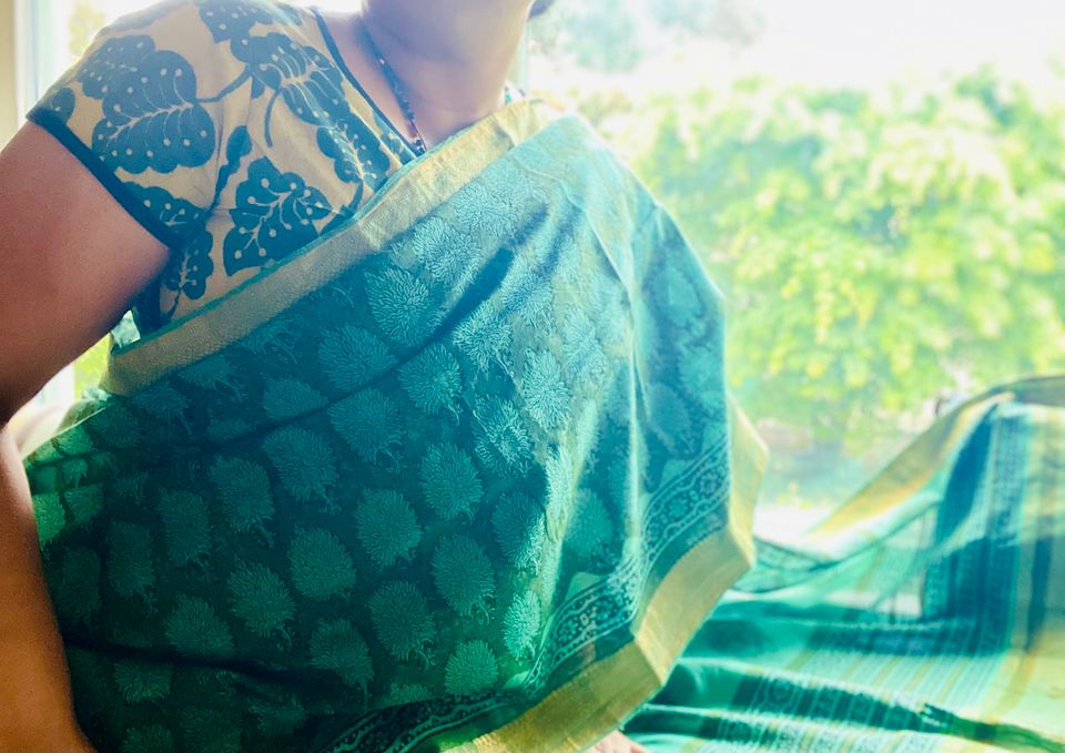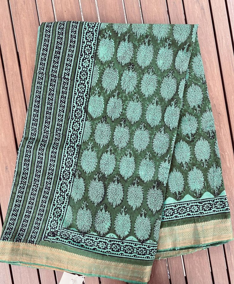A saree in forest green with Bagru/ Dabu hand block prints. Mangalgiri cotton is soft and comfortable to drape!