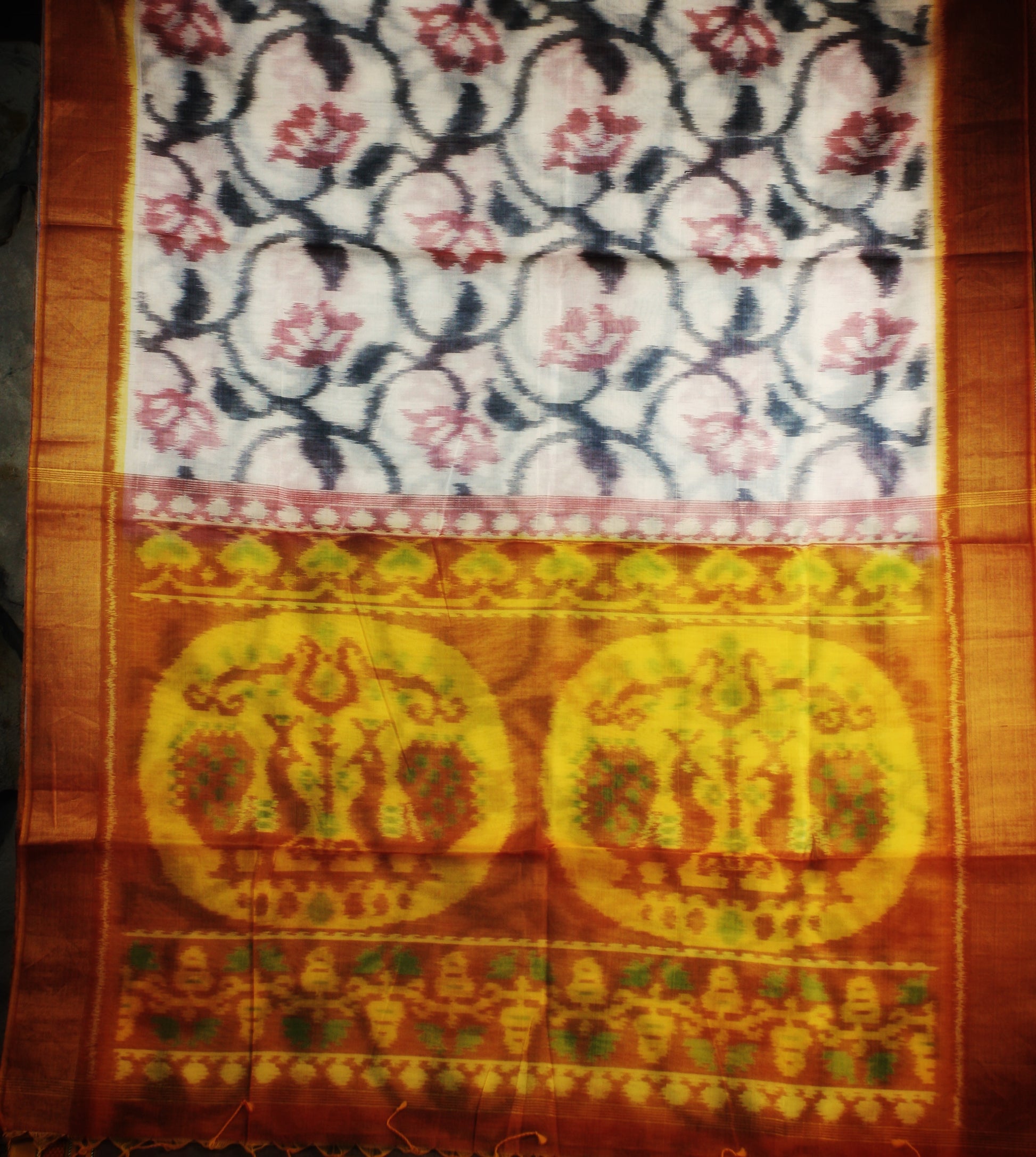 • Pallu: Red and Yellow, Two peacocks facing each other within a circular frame along with border ikat motifs