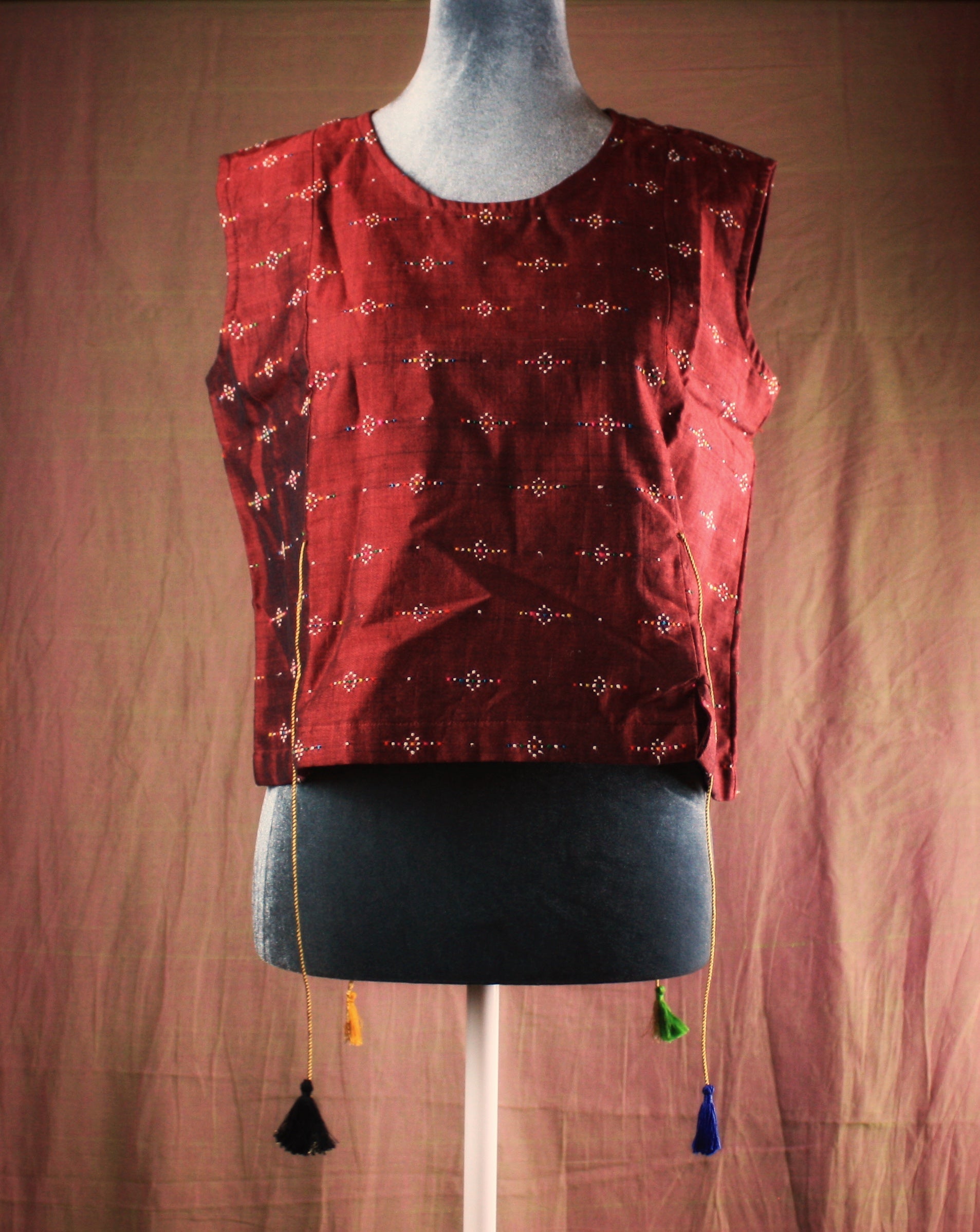 Mini beads of thread woven into the fabric are uniformly spaced to form beautiful geometric patterns! These crop tops are so versatile! Pair it with a pair of pants or our Narayanpet Handloom Langa. Skirts/bottoms sold separately.
