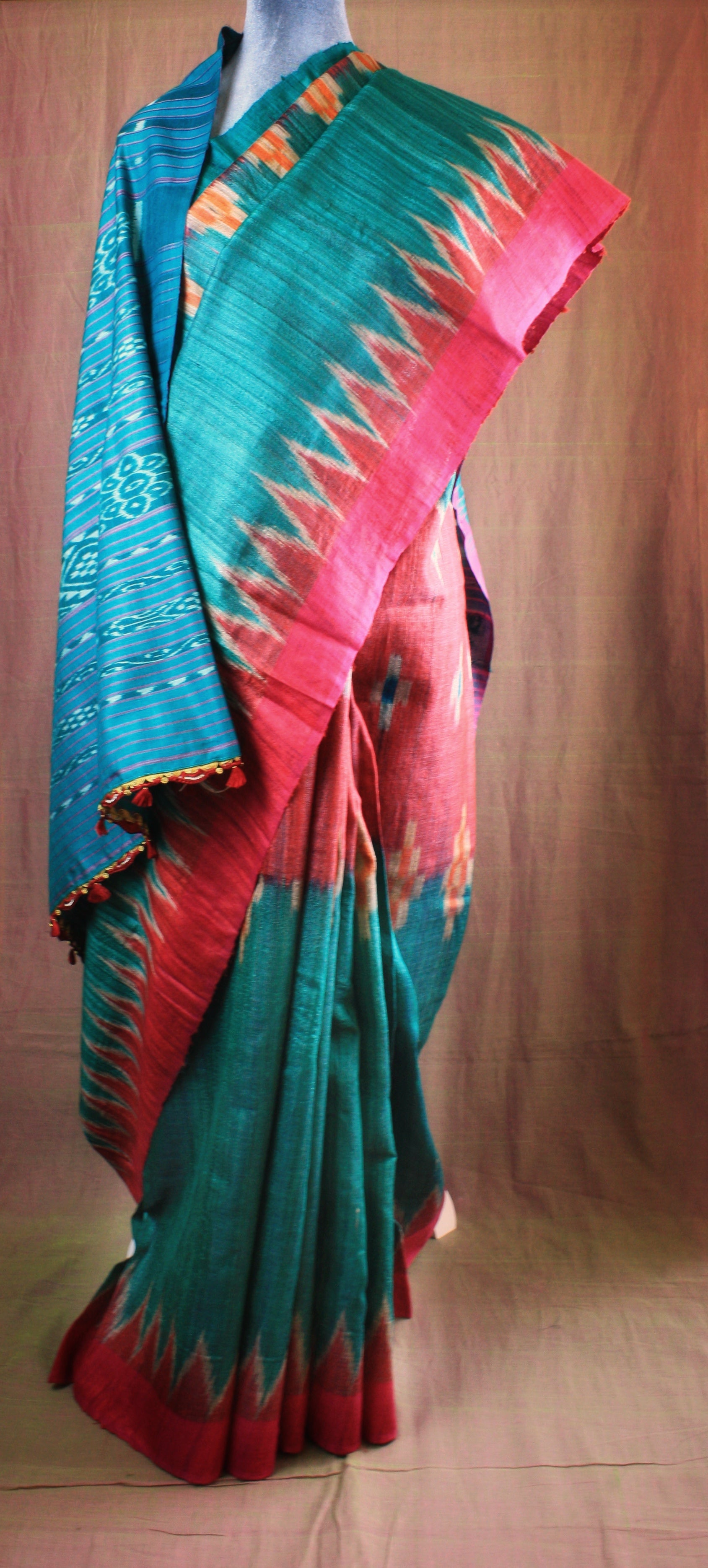 Tussar Ghicha Silk Ikat Handloom Saree - Pink/ Teal Half & Half