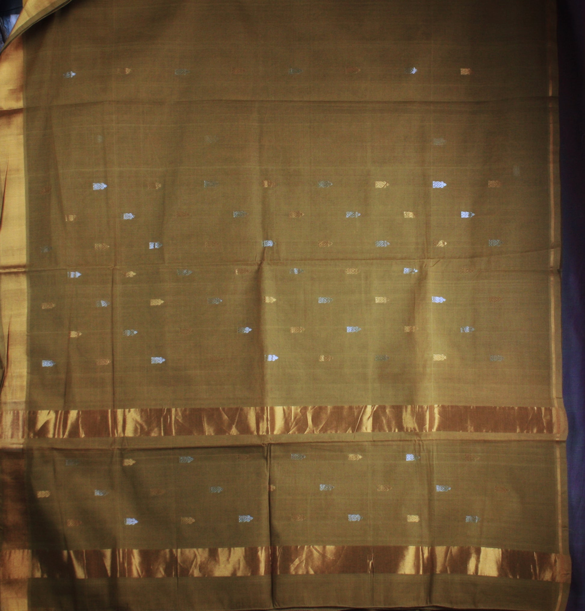 Dainty little motifs in alternating silver and gold zari dance all over this Khaki color cotton saree! The gold tissue border and pallu add to the pizzaz!